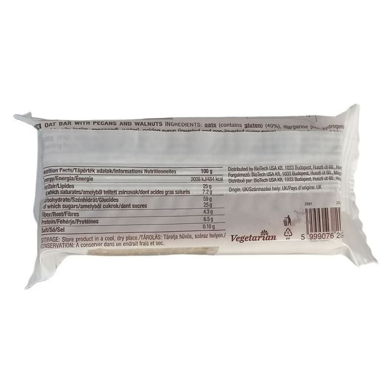 Összetevők: Zabpehely (glutént tartalmaz) (40%), margarin [nem hidrogénezett növényi olajok (pálma, repce), víz], arany szirup (invert- és nem invertcukorszirup), nádcukor, nedvesítőszer (glicerin), pekándió (4%), dió (3,5%), szójaliszt, aroma.