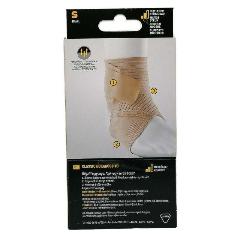 S (18,0-25,0 cm) Speciális jellemzők: állítható pántok a személyre szabott illeszkedés és tartás érdekében. Alkalmazható: bokarándulás, -húzódás, ízületi gyulladás, bokaduzzanat esetén. Terméktípus: zárt. Termékjellemzők és termékelőnyök: tartást és terápiás hőt biztosít. A puha, légáteresztő anyag egész napos kényelmet nyújt. Az állítható pánt felemeli és megtámasztja a talp-boltozatot. A bokarögzítő egyszerűen és diszkréten illeszkedik a cipőbe. Jobb és bal bokán egyaránt alkalmazható.