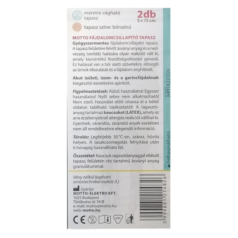 A Motto tapasznak gyulladáscsökkentő hatása is van! Az egy csomagban található 2x 15x5 cm-es tapaszból 6 db 5x5, vagy 10 db 3x5 cm-es darab vágható fel, így folyamatos használat esetén 1-2 hónapra elegendő. A fájdalmak órákon vagy napokon belül enyhülnek, illetve megszűnnek. A Motto tapaszból a fájdalom helyére, tiszta, száraz bőrre 3-5 cm-es csíkot ragasszunk fel.