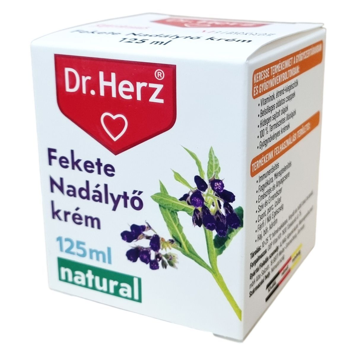 A Dr.Herz fekete nadálytő krém természetes összetevőkkel készült, mesterséges színezékektől és állati eredetű alapanyagoktól mentes készítmény. Német minőségben gyártott termék, mely hozzájárulhat a sejtek gyorsabb regenerálódásához, segíthet a véraláfutások felszívódásában, valamint támogatja a zúzódások, rándulások, ínhüvely-gyulladások és visszerek gyógyulását. Különösen ajánlott sérült vagy fájdalmas bőrfelületek ápolására. A krém használata során a bőrbe masszírozott hatóanyagok segítik a gyógyulási folyamatokat, miközben nem tartalmaz mesterséges színezékeket vagy állati eredetű anyagokat, így megfelel a természetes kozmetikumok iránti igényeknek. A termék elérhető gyógyszertárakban és gyógynövényboltokban, ahol más természetes hatóanyagú termékek, illóolajok, vitaminok és étrend-kiegészítők is kaphatók.