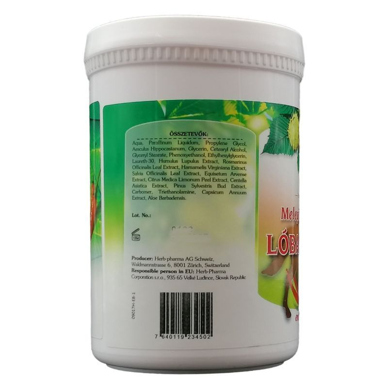Összetevők: Aqua, Paraffinum Liquidum, Propylene Glycol, Aesculus Hippocastanum, Glycerin, Cetearylalkohol, Isopropylmyristate, C12-14 Pareth-30, Harpagophytum Procumbens Extract, Caprylic/Capric Triglyceride, Glycerylstearate, Triethanolamine, Humulus Lupulus Extract, Rosmarinus Officinalic Leaf Extract, Hamamelis Virginiana Extract, Salvia Officinalic Leaf Extract, Equisetum Arvense Extract, Citrus Medica Limonum Peel Extract, Centella Asiatica Extract, Pinus Sylvestris Bud Extract, Carbomer, Dimethicone, Capsicum Annuum Extract, Methylparaben Aloe Barbadensis, 2-Bromo-2-Nitropropane-1,3-Diol, Propylparaben.