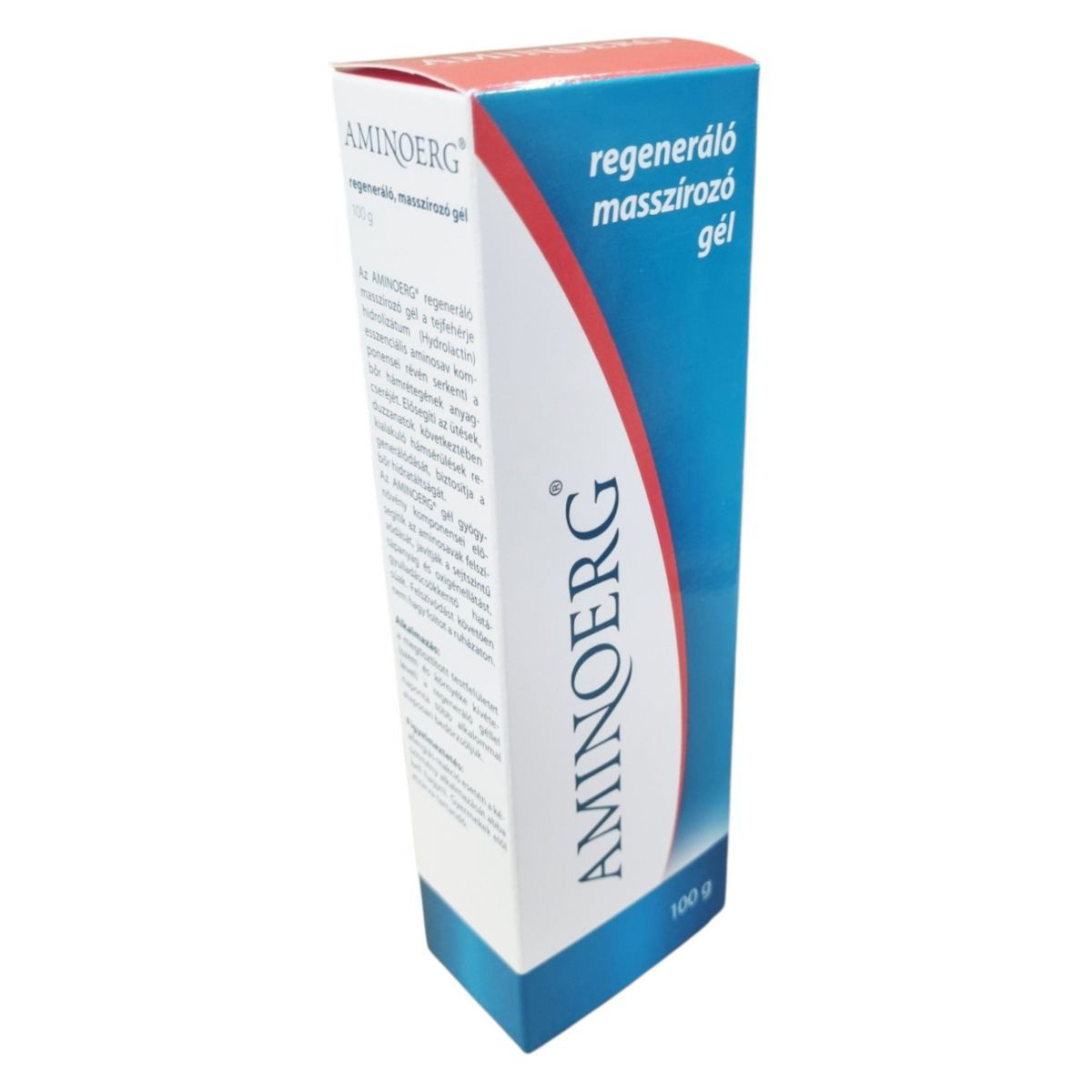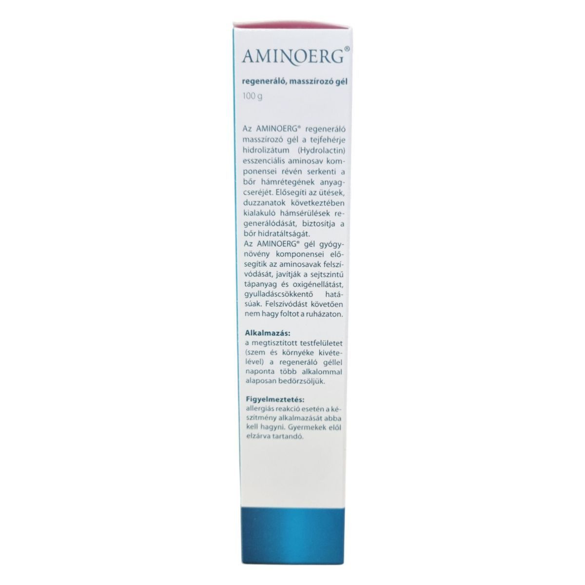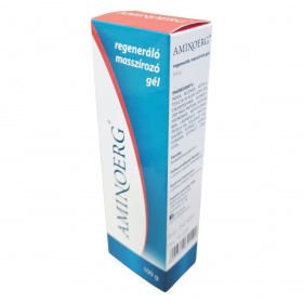 Az AMINOERG® regeneráló masszírozó gél a tejfehérje hidrolizátum (Hydrolactin) esszenciális aminosav komponensei révén hozzájárulhat a bőr hámrétegének anyagcseréjének serkentéséhez. A gél gyógynövény komponensei támogathatják az aminosavak felszívódását, javíthatják a sejtszintű anyag- és oxigénellátást, valamint gyulladáscsökkentő hatásúak lehetnek. A termék felszívódást követően nem hagy foltot a ruházaton. A felhasználhatóság és a gyártási tételszám a doboz oldalán található.