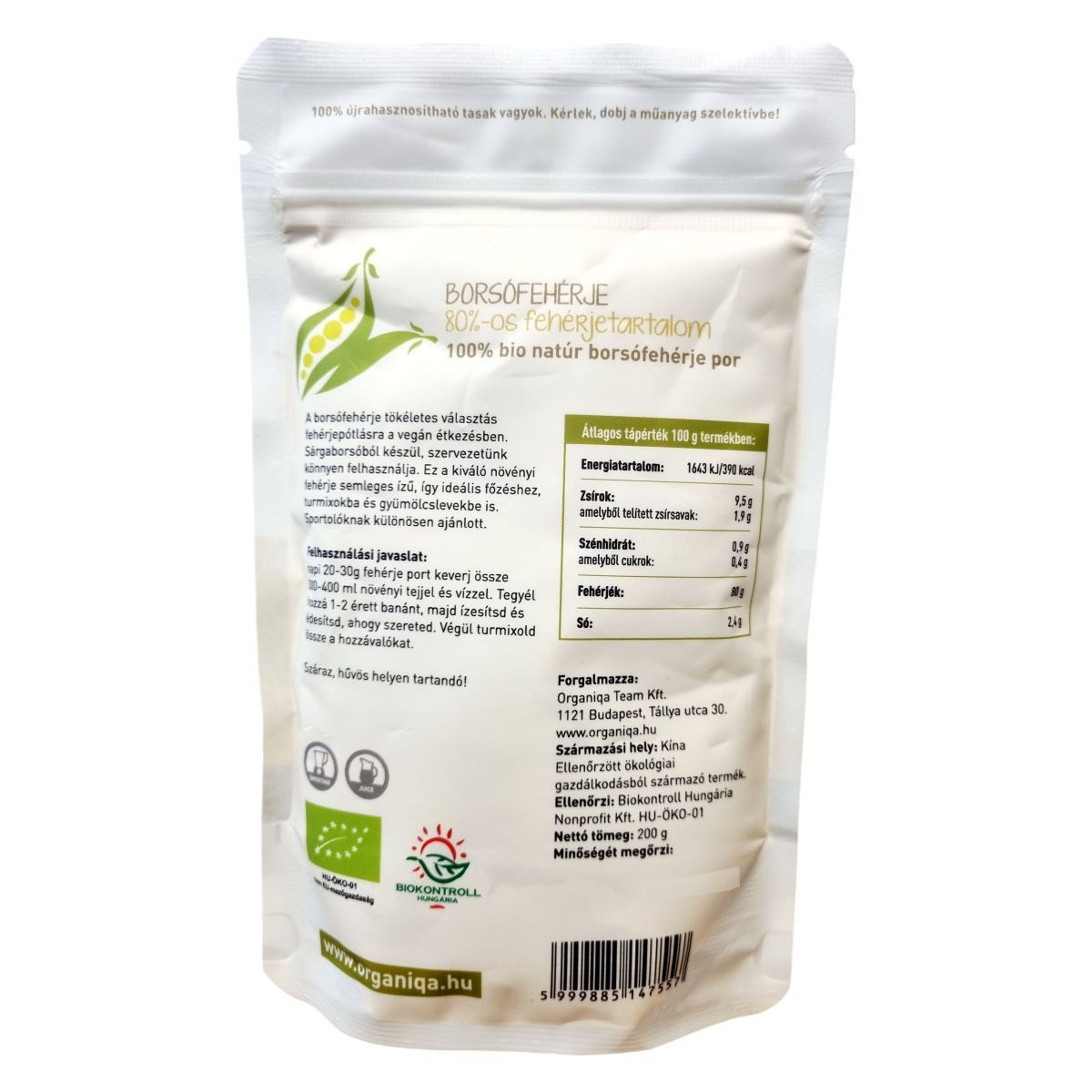 Az Organiqa Borsófehérje por 100% bio sárgaborsóból készül, és ideális választás lehet a vegán étrendben történő fehérjepótlásra. Semleges ízének köszönhetően könnyen beilleszthető különféle ételekbe, turmixokba és gyümölcslevekbe. A termék 80%-os fehérjetartalommal rendelkezik, és sportolóknak különösen ajánlott lehet. A borsófehérje por újrahasznosítható tasakban érkezik, így környezetbarát választás is. A termék Kínából származik, és ellenőrzött ökológiai gazdálkodásból származik, amit a Biokontroll Hungária Nonprofit Kft. ellenőriz.