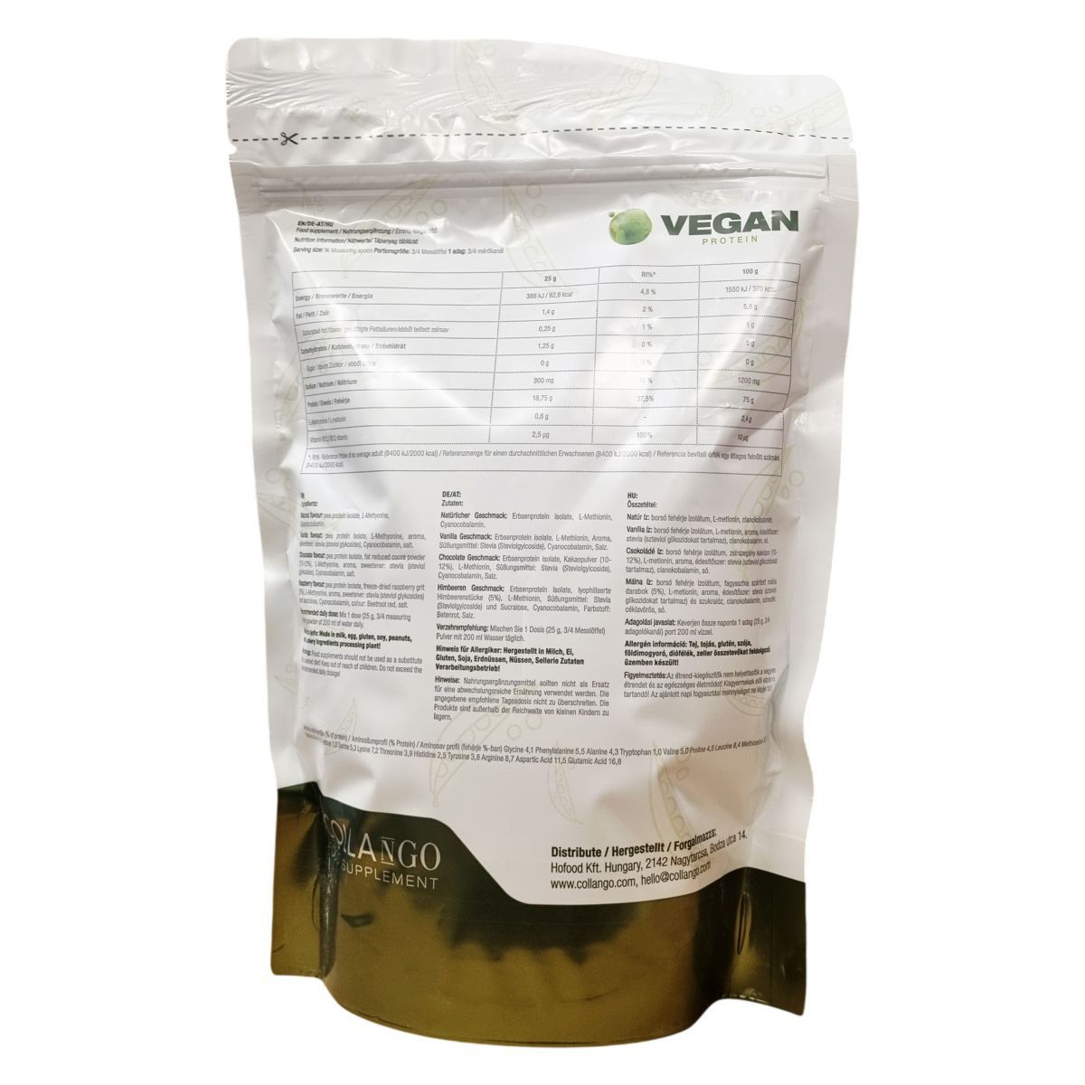 A Collango Vegan Protein egy borsófehérje-alapú étrend-kiegészítő, amely természetes és különböző ízekben érhető el, például natúr, vanília, csokoládé és málna. Az összetevők között szerepel az L-metionin és a B12-vitamin, amely a cianokobalamin formájában található meg. Az édesítés steviolglikozidokkal történik, így a termék hozzáadott cukrot nem tartalmaz. Egészséges életmódot támogató vegán étrendhez ajánlott, amely gluténmentes és tejterméket sem tartalmaz. A termék előállítása olyan üzemben történik, ahol tej, tojás, glutén, szója, földimogyoró, diófélék és zeller összetevőket is feldolgoznak. A tápértékadatok szerint magas a fehérjetartalma, valamint B12-vitamin és L-metionin forrása lehet, energiát és fontos tápanyagokat szolgáltatva a szervezetnek.