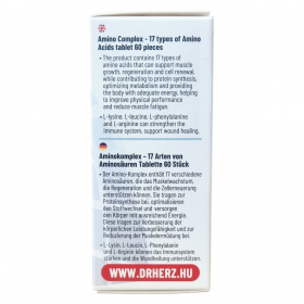 Amino Komplex – 17-féle aminosavat tartalmazó tabletta, 60 darabos kiszerelés. A készítmény 17 különböző aminosavat tartalmaz, amelyek támogathatják az izomnövekedést, a regenerációt és a sejtek megújulását, hozzájárulnak a fehérjeszintézishez, optimalizálják az anyagcserét, valamint megfelelő energiával látják el a szervezetet, segítve a fizikai teljesítmény javítását és az izomfáradtság csökkentését. Az L-lizin, L-leucin, L-fenilalanin és L-arginin hozzájárulhatnak az immunrendszer erősítéséhez és a sebgyógyulás támogatásához. 60 napi adag. Minőségét megőrzi: a doboz alján jelzett időpont (hónap, év) végéig.