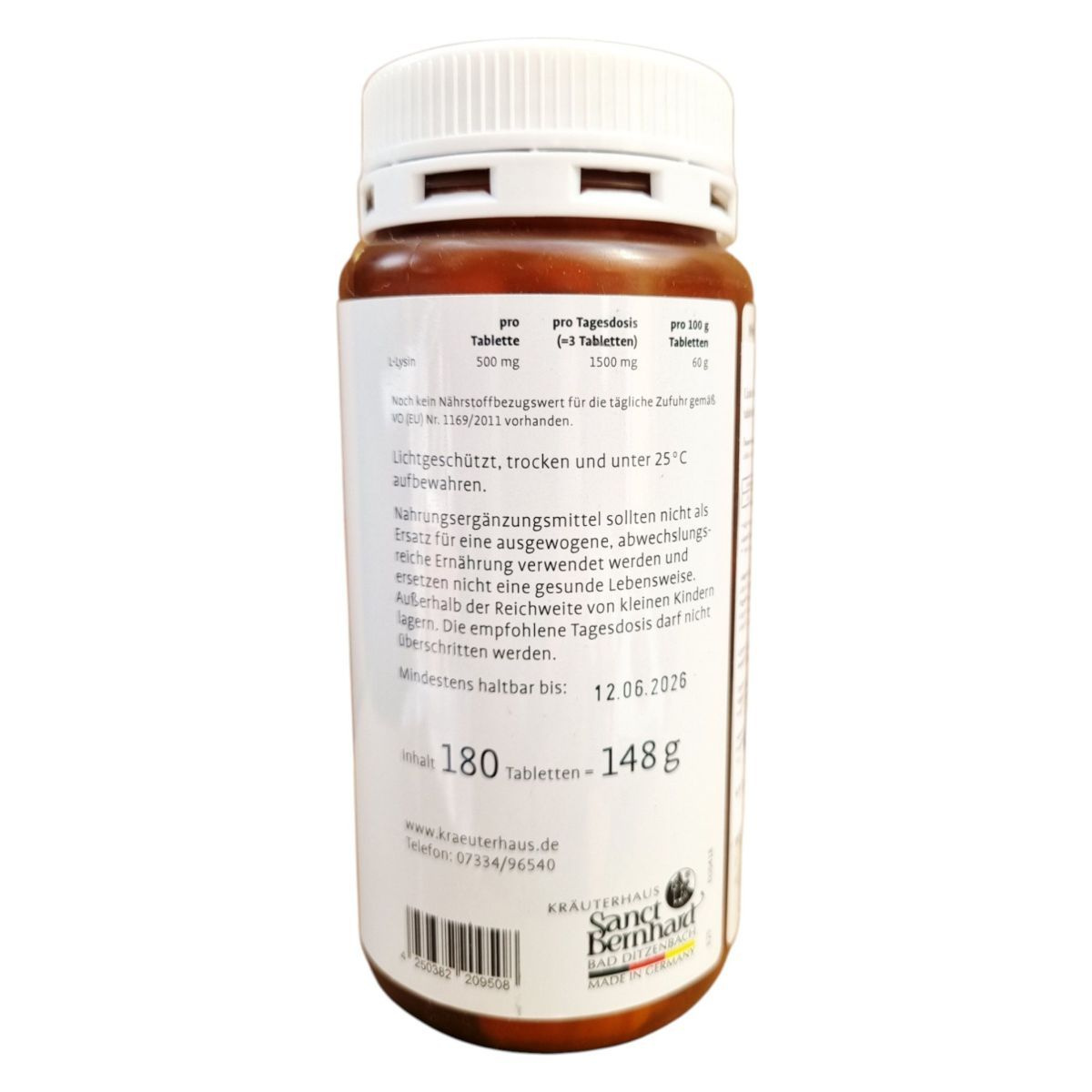 A Sanct Bernhard Lysin étrend-kiegészítő tabletta L-lizin-hidrokloridot tartalmaz, amely egy fontos aminosav lehet a szervezet számára. A termék napi adagja három tablettából áll, ami összesen 1500 mg L-lizint biztosíthat. Az étrend-kiegészítő nem helyettesíti a kiegyensúlyozott étrendet és az egészséges életmódot. A terméket hűvös, száraz helyen, 25 °C alatt kell tárolni, és gyermekektől elzárva tartandó. A termék Németországban készült, és a KRAUTERHAUS Sanct Bernhard gyártja.