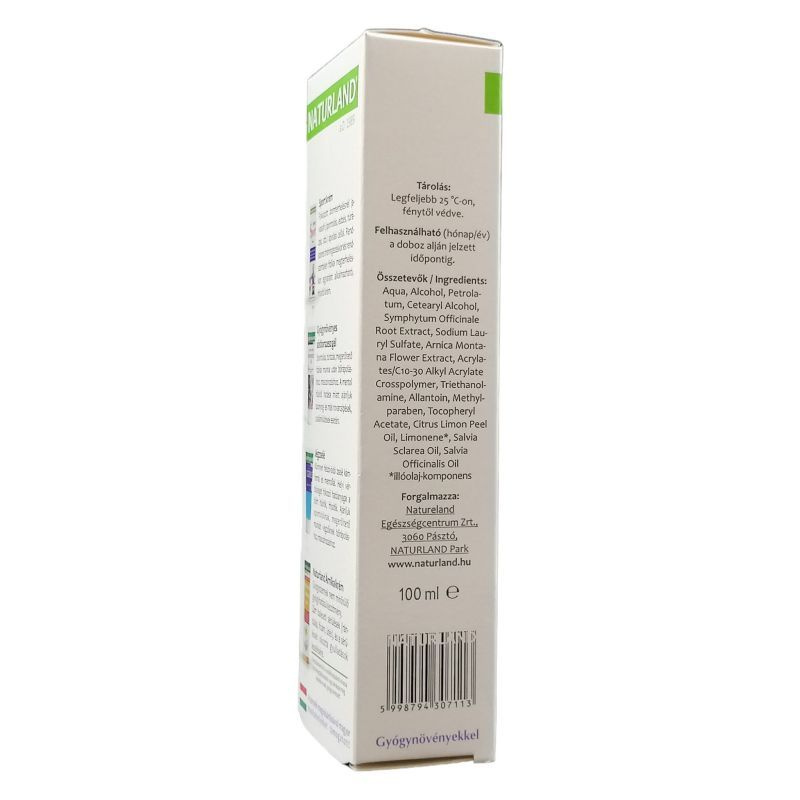 Összetevők: Aqua, Alcohol, Petrolatum, Cetearyl Alcohol, Symphytum Officinale Root Extract, Sodium Lauryl Sulfate, Arnica Montana Flower Extract, Acrylates/C10-30 Alkyl Acrylate Crosspolymer, Triethanolamine, Allantoin, Methylparaben, Tocopheryl Acetate, Citrus Limon Peel Oil, Limonene, Salvia Sclarea Oil, Salvia Officinalis Oil.