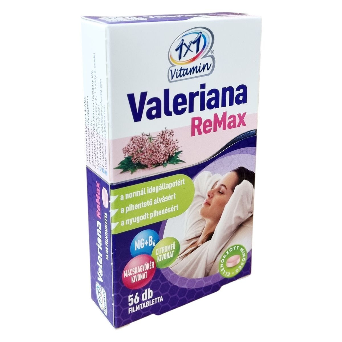 A Valeriana officinalis (macskagyökér) hozzájárulhat a megfelelő idegállapot és a normál alvás fenntartásához, míg a citromfű hozzájárulhat a nyugodt alváshoz és a megfelelő pihenéshez. A termék filmtabletta formában kapható, nettó tömege 28 g, 56 darab 500 mg-os tablettát tartalmaz. Minőségét a doboz alján jelzett időpontig őrzi meg. A termék ellenőrzött minőségű, és az Európai Unió területén készült.