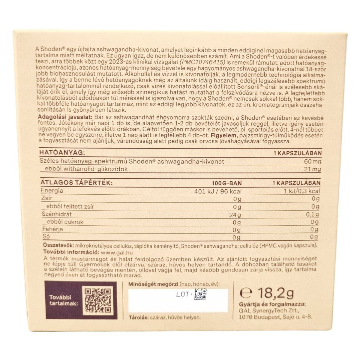 Mikrokristályos cellulóz, tápióka keményítő, Shoden® ashwagandha-kivonat, cellulóz (HPMC vegán kapszula)