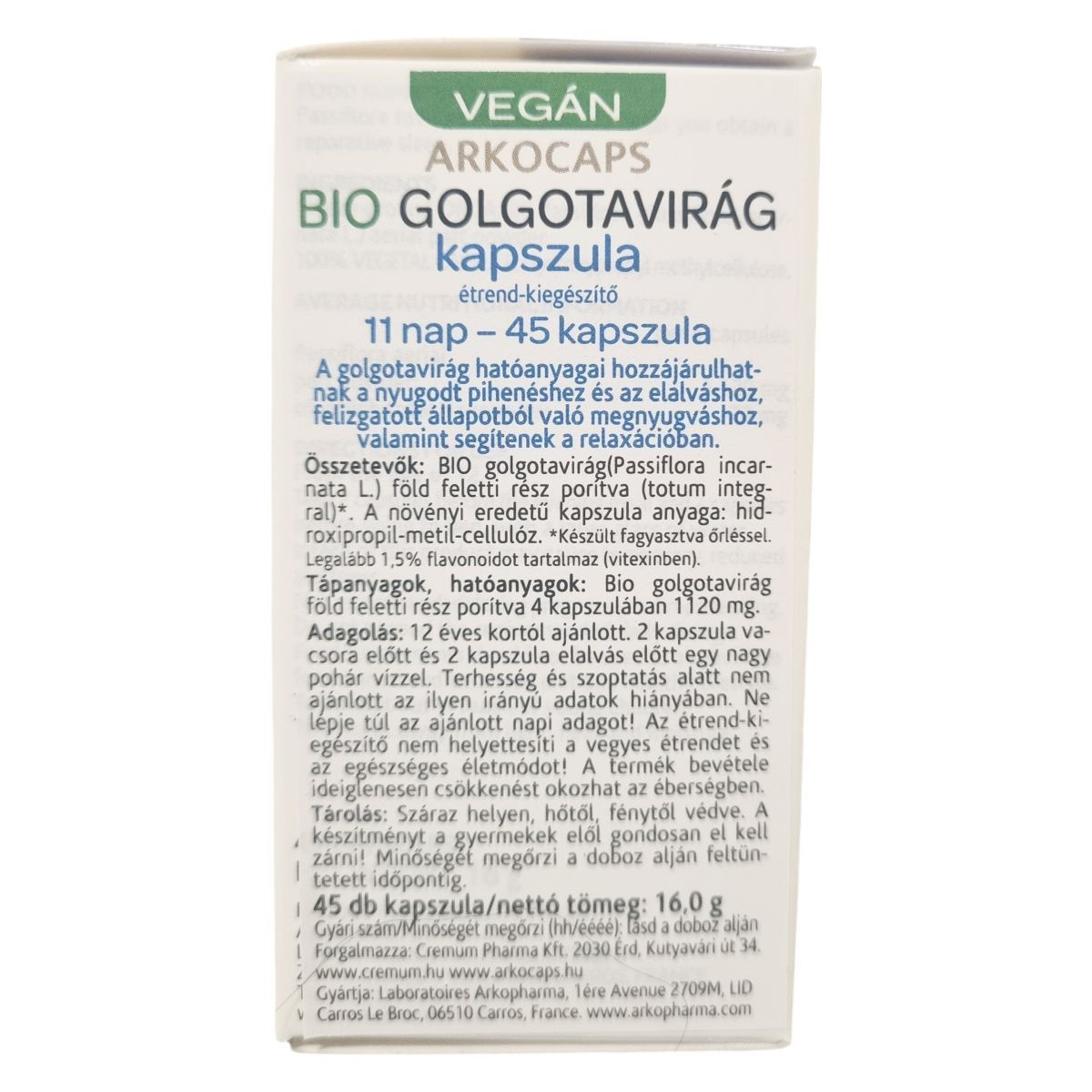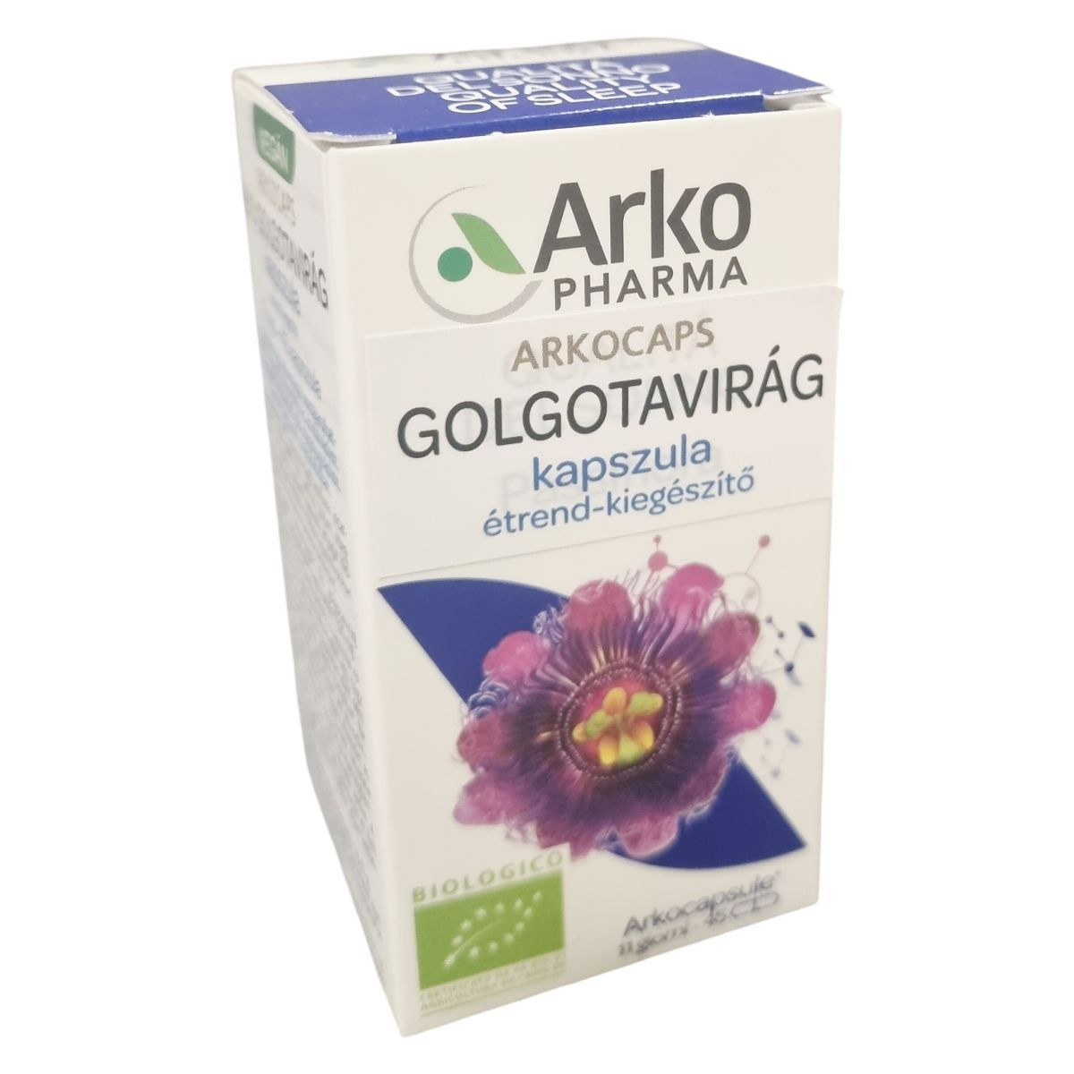 Az Arkocaps® Golgotavirág kapszula bio golgotavirág (Passiflora incarnata L.) föld feletti részét tartalmazó étrend-kiegészítő. A növényi hatóanyag hozzájárulhat a relaxációhoz, a nyugodt pihenéshez és az elalvás elősegítéséhez, valamint segítheti a felizgatott állapotból való megnyugvást. A gyártáshoz fagyasztva őrlési technológiát alkalmaznak, mely biztosítja a hatóanyagok megőrzését, így a készítmény legalább 1,5% flavonoidot, főként vitexint tartalmaz. A kapszula növényi eredetű, hidroxi-propil-metil-cellulóz alapú, így a termék vegán és bio tanúsítvánnyal rendelkezik. Az adagolás 12 éves kortól javasolt, és a termék szedése ideiglenesen csökkenést okozhat az éberségben. Terhes és szoptató nők számára nem ajánlott. A termék nem helyettesíti a kiegyensúlyozott étrendet és az egészséges életmódot. Tárolása száraz, hűvös és sötét helyen ajánlott, gyermekektől elzárva.
