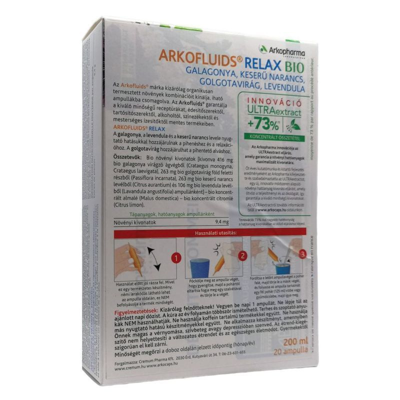 A galagonya, a levendula és a keserű narancs levele nyugtató hatásukkal hozzájárulnak a pihenéshez és a relaxációhoz. A golgotavirág hozzájárulhat a pihentető alváshoz. Az Arkofluids, márka kizárólag organikusan termesztett növények kombinációit kínálja, iható ampullákba csomagolva. Az Arkofluids garantálja a kiváló minőségű receptúrákat, édesítőszerektől, tartósítószerektől, alkoholtól, színezékektől és mesterséges ízesítőktől mentes termékeiben.