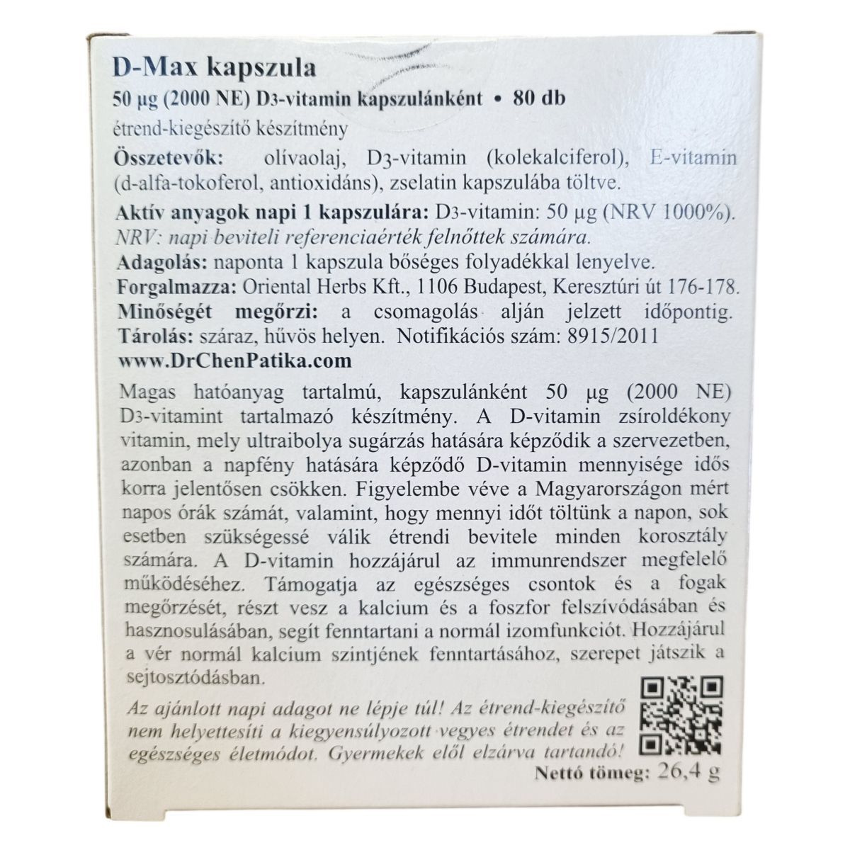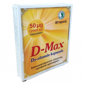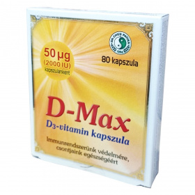 A D-Max kapszula magas hatóanyagtartalmú készítmény, mely kapszulánként 50 µg (2000 NE) D3-vitamint tartalmaz. A D-vitamin zsírban oldódó vitamin, amely ultraibolya sugárzás hatására keletkezik a szervezetben, azonban a napfény hatására képződő mennyiség az életkor előrehaladtával jelentősen csökkenhet. Tekintettel a Magyarországon mért napos órák számára és a napon eltöltött időre, sok esetben szükségessé válhat a D3-vitamin pótlása minden korosztály számára az étrenddel. A D-vitamin hozzájárulhat az immunrendszer működéséhez, támogathatja az egészséges csontok és fogak megőrzését, részt vehet a kalcium és foszfor felszívódásában és hasznosulásában, segítheti a normál izomfunkció fenntartását, hozzájárulhat a normál vér kalciumszintjének fenntartásához, valamint szerepet játszhat a sejtosztódásban.