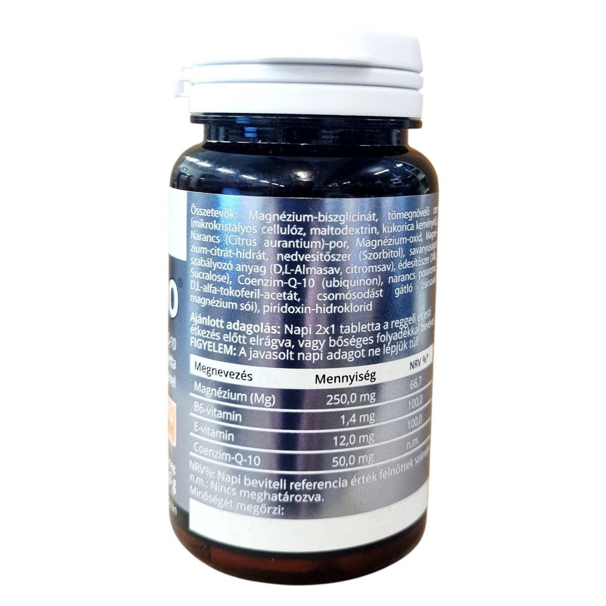 Narancs ízű rágótabletta magnéziummal, B6-vitaminnal, E-vitaminnal és koenzim-Q-10-zel, édesítőszerrel készült étrend-kiegészítő.