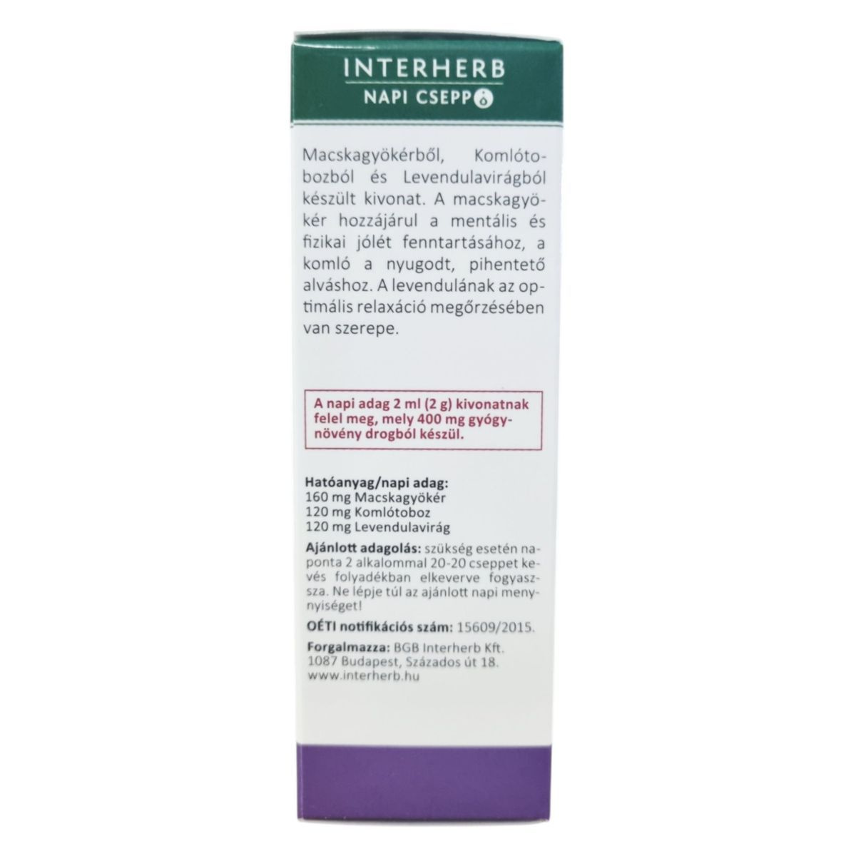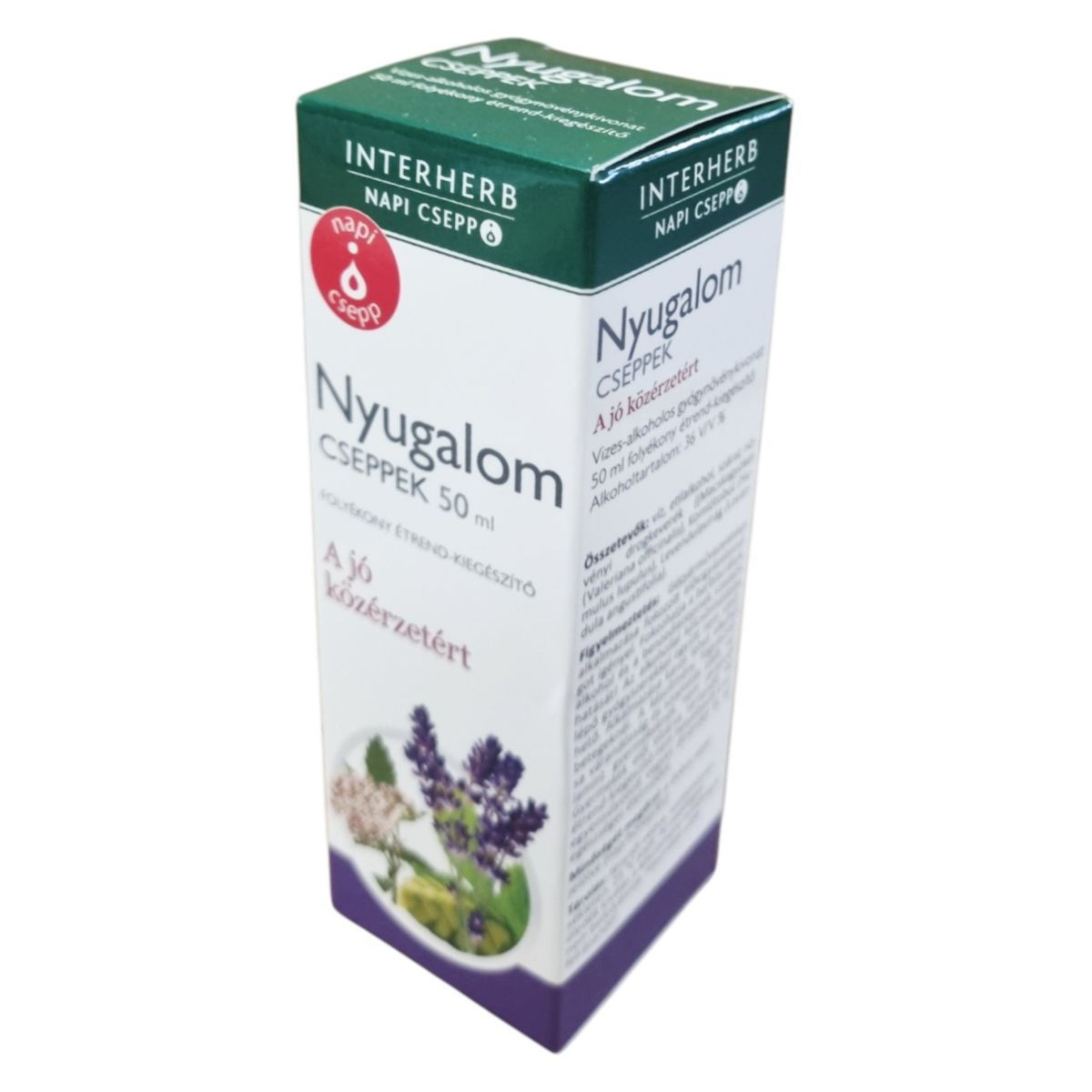 Az INTERHERB NAPI CSEPP Nyugalom CSEPPEK egy vizes-alkoholos gyógynövénykivonat, amely 50 ml-es kiszerelésben kapható. Az alkoholtartalma 36 V/V %. A termék macskagyökér, komlótoboz és levendulavirág kivonatát tartalmazza, amelyek hozzájárulhatnak a mentális és fizikai jólét fenntartásához, valamint a nyugodt, pihentető alváshoz. A napi adag 2 ml kivonatnak felel meg, amely 400 mg gyógynövény drogból készül. A termék használata során fontos a figyelmeztetések betartása, különösen gépjárművezetéskor és bizonyos gyógyszerek szedése esetén.