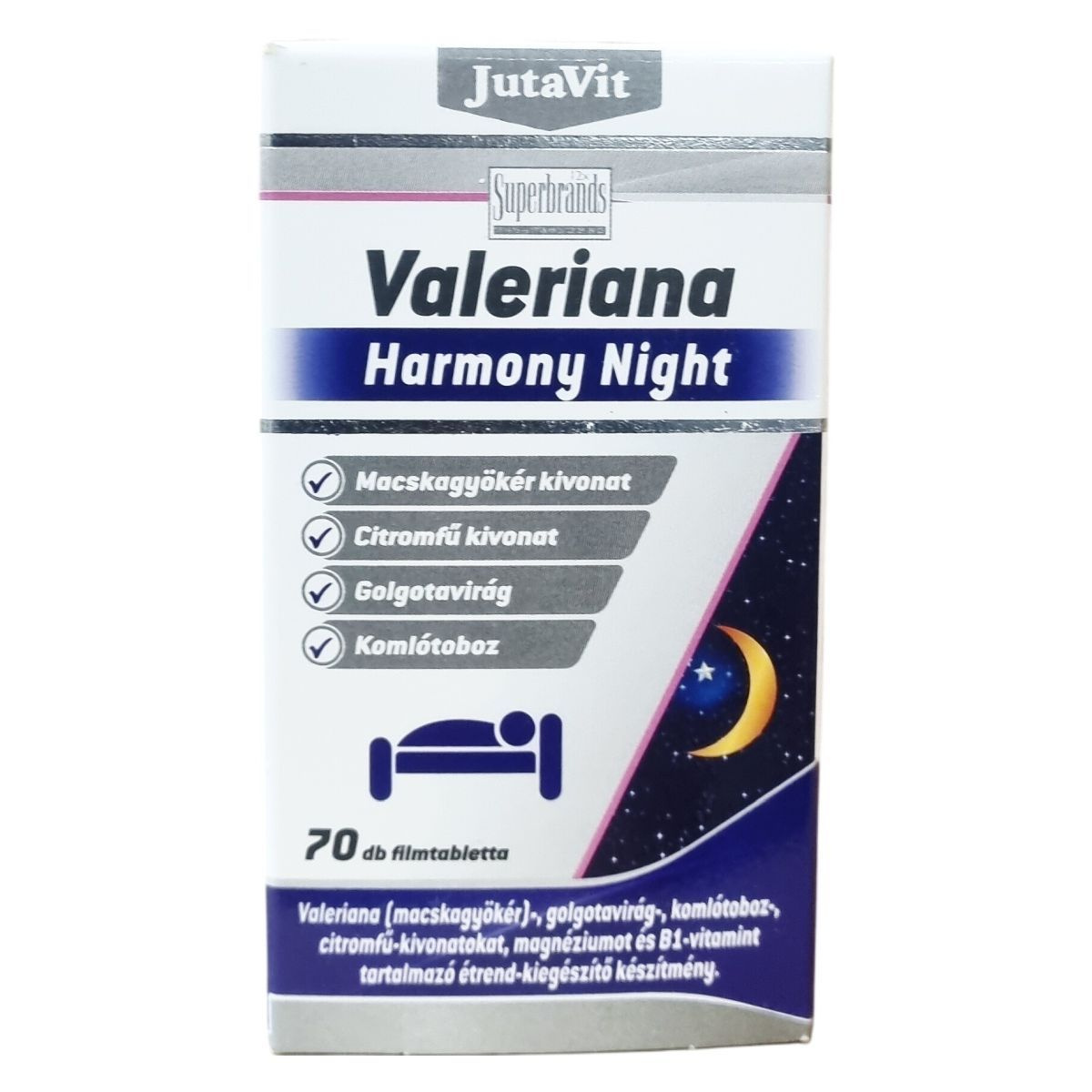 A JutaVit Valeriana Harmony Night egy étrend-kiegészítő készítmény, amely macskagyökér-, golgotavirág-, komlótoboz- és citromfű-kivonatokat, valamint magnéziumot és B1-vitamint tartalmaz. A termék filmtabletta formában, 70 darab kiszerelésben érhető el. A készítmény használatakor ajánlott a lefekvés előtti időszakban 1-2 filmtablettát folyadékkal bevenni. A komponensek megválasztása révén a termék hozzájárulhat a relaxációhoz és a nyugodt éjszakai pihenés támogatásához. A macskagyökér tartalma miatt a használat során fokozott figyelem ajánlott a gépjárművezetés és veszélyes gépek kezelése terén. A készítmény nem helyettesíti a kiegyensúlyozott étrendet és az egészséges életmódot, gyermekek, várandós és szoptató nők számára történő alkalmazása nem javasolt.