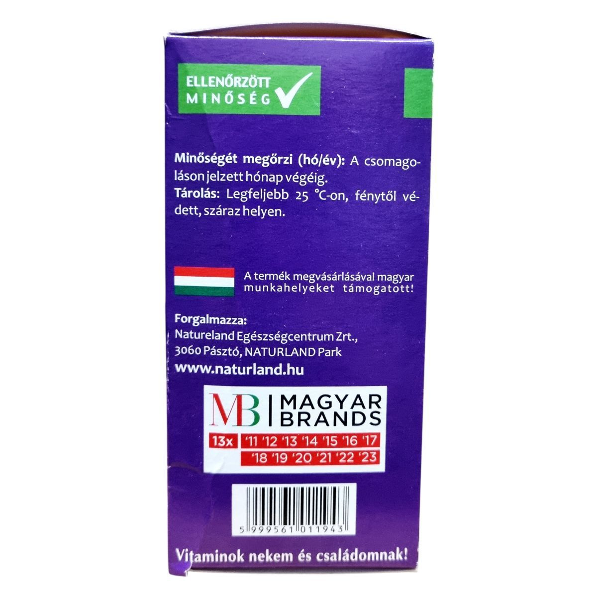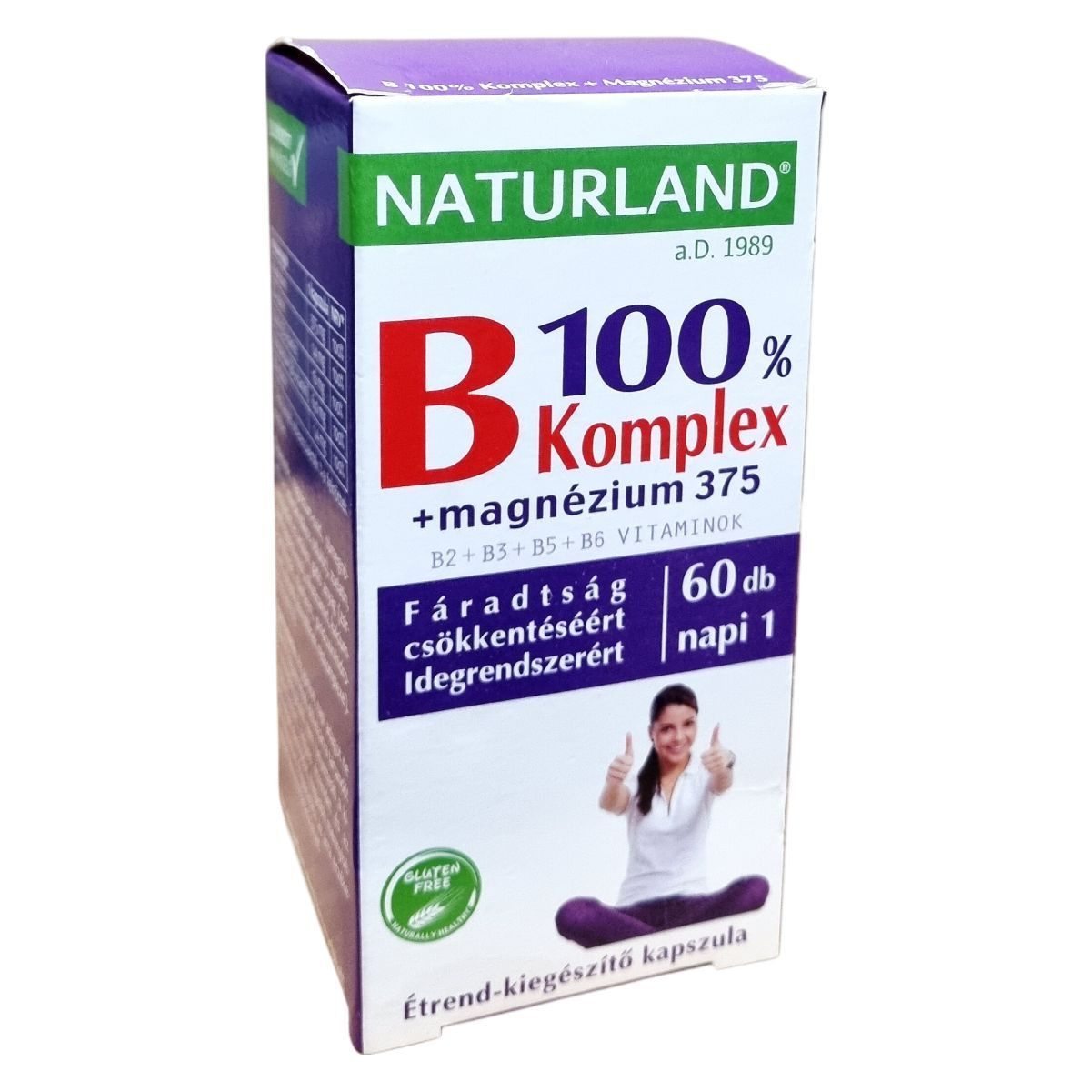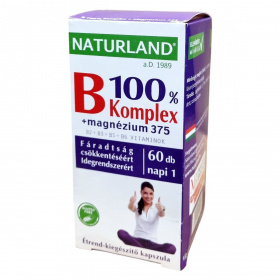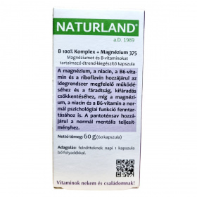 A NATURLAND B 100% Komplex + Magnézium 375 étrend-kiegészítő kapszula magnéziumot és különböző B-vitaminokat tartalmaz, amelyek hozzájárulhatnak az idegrendszer megfelelő működéséhez, a fáradtság csökkentéséhez és a normál pszichológiai funkciók fenntartásához. A termék támogatja a magyar munkahelyeket, és minőségi alapanyagokból készül. A kapszulák gluténmentesek, így gluténérzékenyek is fogyaszthatják. A termék használata során fontos betartani az ajánlott napi adagot, és figyelembe venni, hogy nagyobb mennyiségű magnézium hashajtó hatású lehet az érzékeny egyéneknél.
