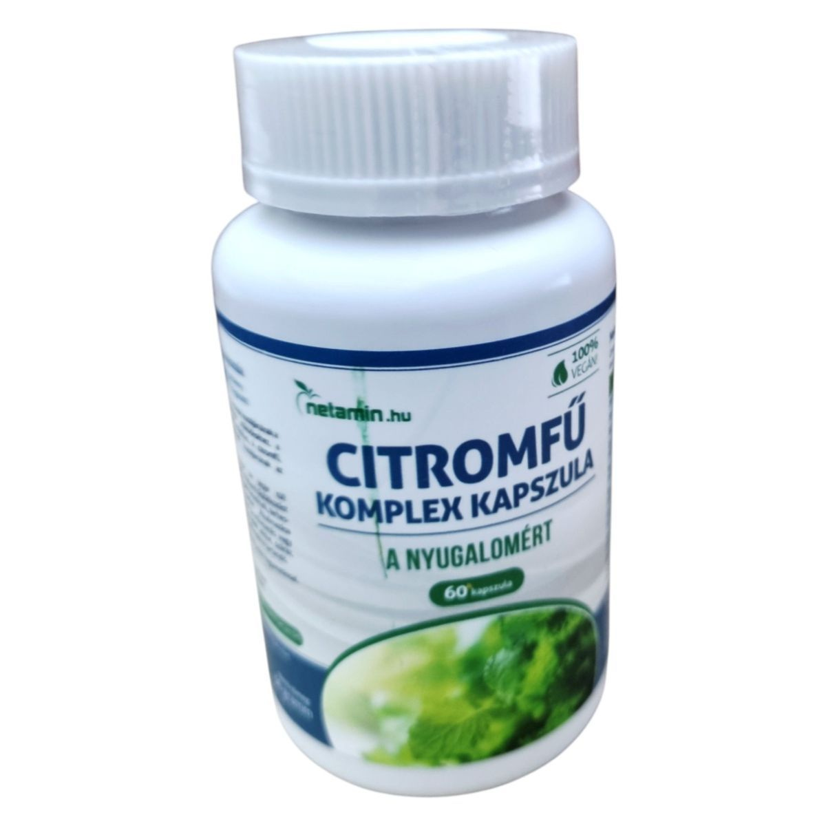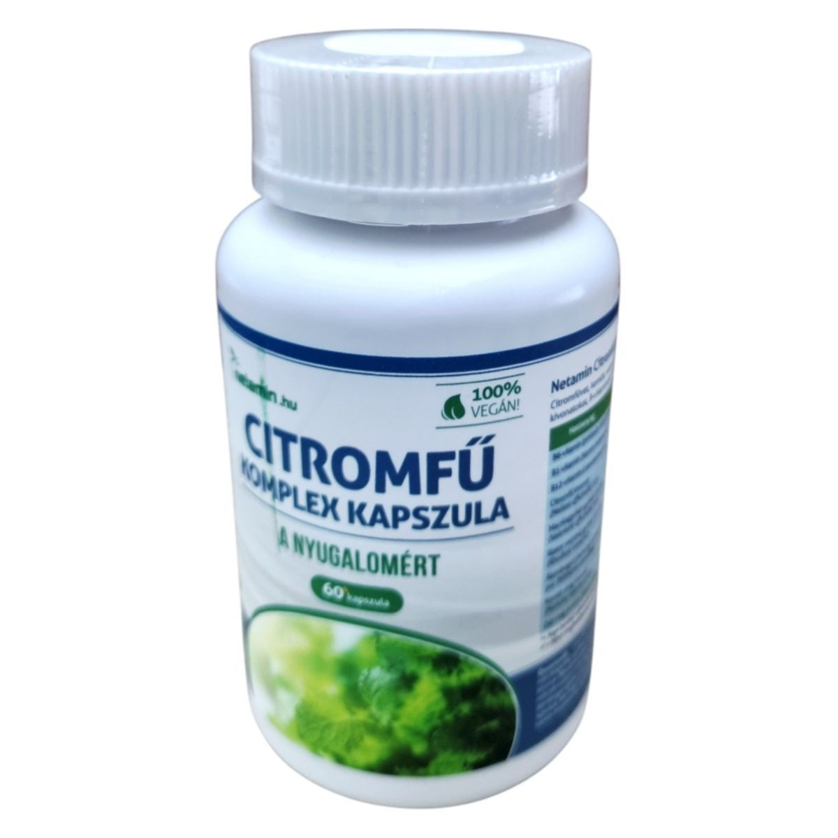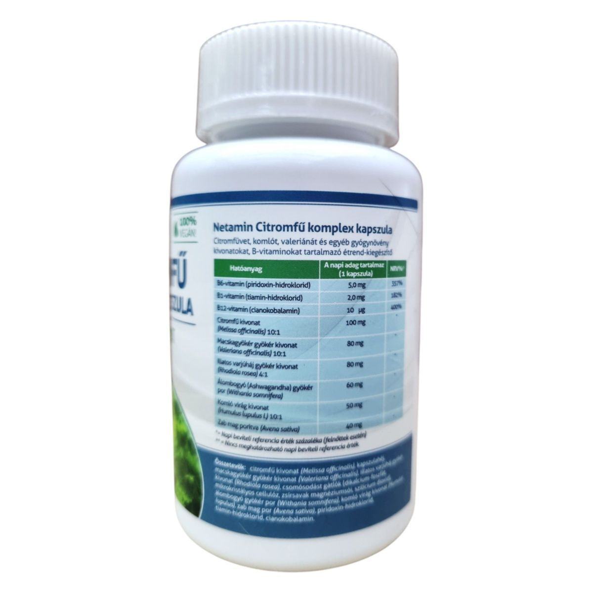 A Netamin Citromfű komplex kapszula egy 100% vegán étrend-kiegészítő, amely citromfüvet, komlót, valeriánát és más gyógynövény kivonatokat, valamint B-vitaminokat tartalmaz. A termék célja, hogy támogassa a nyugodt és kiegyensúlyozott pszichés funkciókat. A B1- és B6-vitaminok hozzájárulhatnak az idegrendszer egészséges működéséhez, míg a macskagyökér és a varjúháj a fáradtság csökkentéséhez járulhat hozzá. A termék használata előtt javasolt orvosi konzultáció, különösen terhesség, szoptatás vagy 14 éves kor alatti gyermekek esetén.