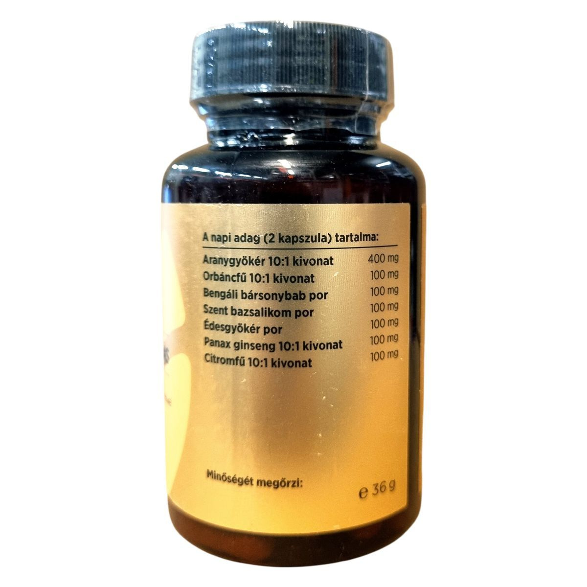 aranygyökér kivonat, orbáncfű kivonat, bengáli bársonybab por, szent bazsalikom por, édesgyökér por, ginzeng kivonat, citromfű kivonat, növényi cellulóz (kapszula)