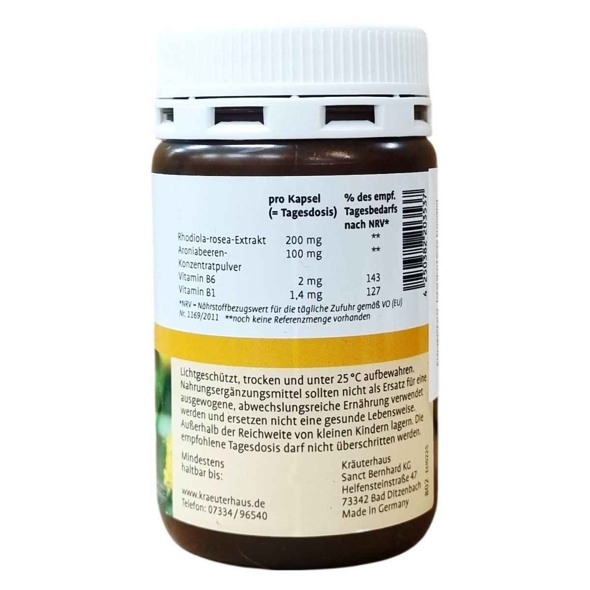 A készítmény Rhodiola rosea (aranygyökér) és arónia bogyó koncentrátumot tartalmaz, melyek természetes eredetű összetevők. Emellett B1- és B6-vitaminokat is magában foglal. A kapszula formájú étrend-kiegészítő kiszerelése 120 darab, ami a napi adagolás szerint több mint három hónapra elegendő. A termék Németországban készül, és ajánlott napi bevitele 1 kapszula, melyet bő folyadékkal kell lenyelni. Az étrend-kiegészítő jellegénél fogva nem helyettesíti a változatos, kiegyensúlyozott étrendet és az egészséges életmódot. A készítményt gyerekektől távol kell tartani, és a csomagoláson feltüntetett adagolási utasítást nem szabad túllépni.