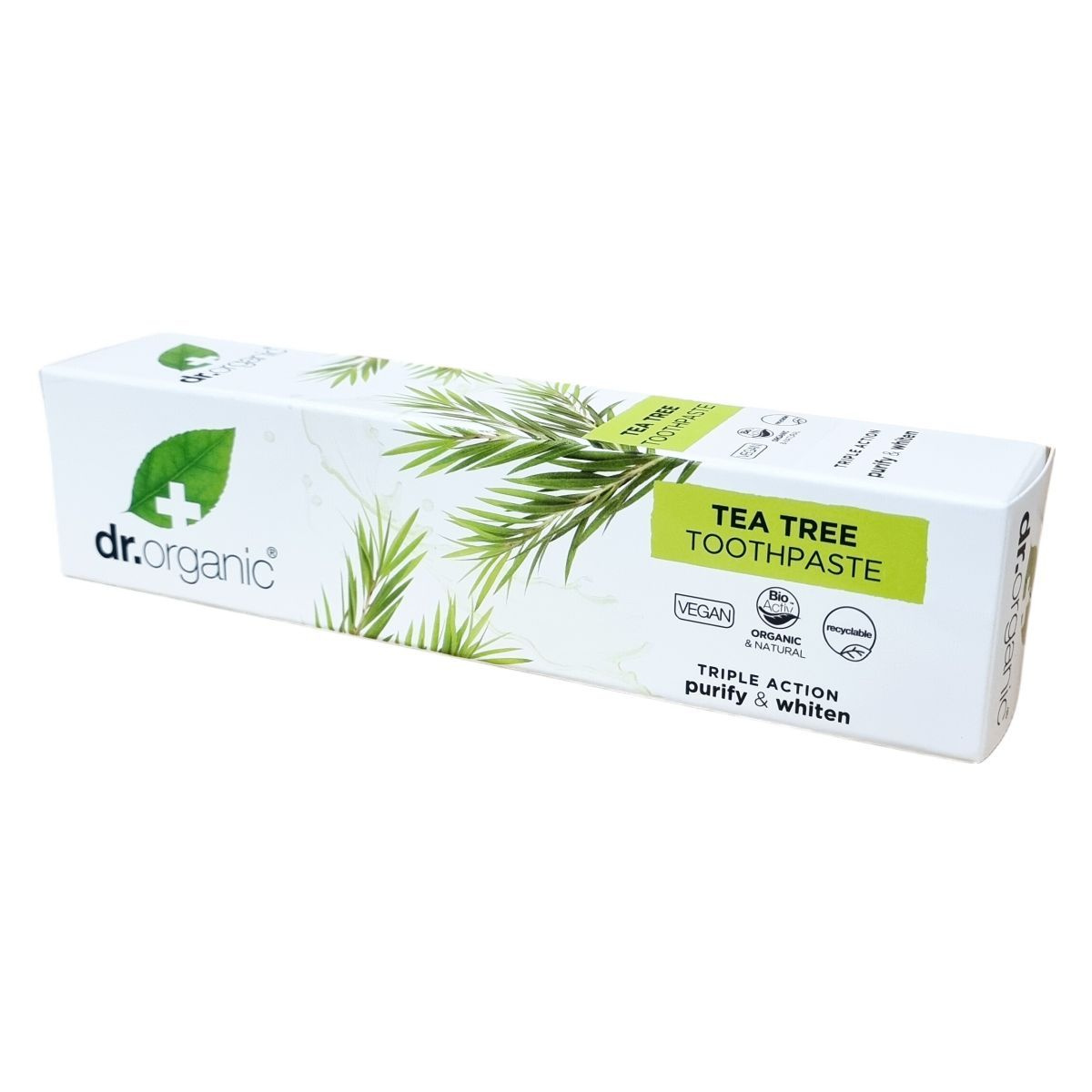 A dr.organic® TEA TREE fogkrém organikus és természetes alapanyagokból készül, és bio aktiv összetevőket tartalmaz, amelyek hozzájárulnak a fogak tisztaságához és egészségéhez. A termék újrahasznosítható csomagolásban érkezik, és állatkísérlet-mentes minősítéssel rendelkezik. A fogkrém nátrium-monofluorofoszfátot tartalmaz, amely 1000 ppm fluoridot biztosít a fogszuvasodás elleni védelemhez. A használati útmutató szerint a terméket orális használatra fejlesztették ki, és a gyermekfogmosás során szigorú felügyelet mellett alkalmazandó, különösen 6 év alatti gyermekek esetében. A termékben lévő hatóanyagok között szerepel a bio teafaolaj, mentalevél olaj, valamint izlandi zuzmó kivonat, amelyek tisztító és frissítő hatásúak. A csomagolás jelzése alapján 12 hónapig használható a felbontás után. A gyártás helye Olaszország.