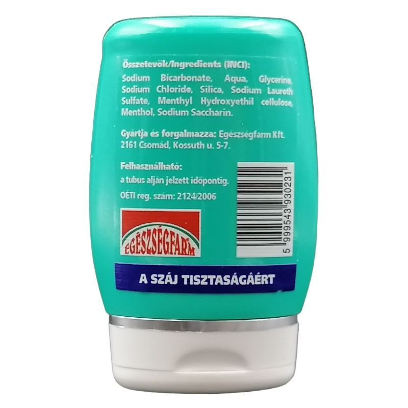 Összetevők: Sodium Bicarbonate, Aqua, Glycerine, Sodium Chloride, Silica, Sodium, Laureth Sulfate, Menthyl Hydroxyethil cellulose, Menthol, Titanium Dioxyde, Sodium Saccharin