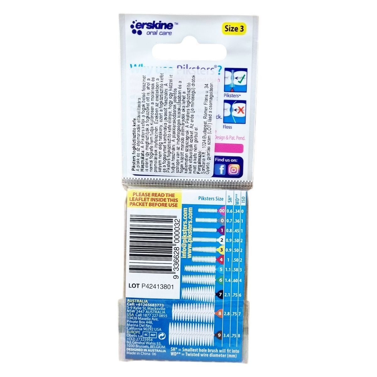 A Piksters fogköztisztító kefék Ausztráliában tervezettek, és Kínában készülnek. A csomag 10 darabot tartalmaz, melyek különböző méretekben elérhetők, a fogköztisztító kefe szára erősebb és merevebb drótból készült, így nem hajlik el használat közben. A méret szerinti színes fogantyú könnyíti a megfelelő választást. A kefék kiváltják vagy kiegészítik a fogselyem használatát, könnyebb használhatóságot biztosítva, különösen a hátsó fogakhoz való hozzáférésnél. A termék az ausztrál márka első számú terméke, melyet több mint 90% fogászati szakember javasol, és praktikus megoldást nyújt a napi szájápolásban.
