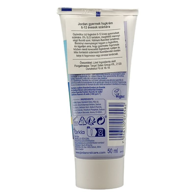 Maradó fogakhoz való Jordan Junior fogkrém gyengéd formulával és gyümölcsös ízzel 6-12 éves gyerekek számára. Flourid-szintje a kornak megfelelő, nem tartalmaz SLS-t.
