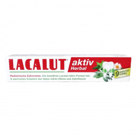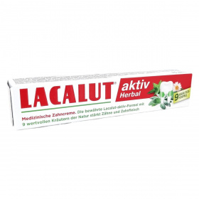 A Lacalut aktiv Herbal fogkrém a jól bevált Lacalut aktiv formulát és kilenc értékes gyógynövényt kombinál, melyek természetes eredetű összetevők 94,5%-át teszik ki. A termék értékes gyógynövényekkel, mint a mirha-kivonat és rozmaring, édeskömény, csillagánizs, eukaliptusz, borsmenta, kakukkfű, kamilla és zsálya illóolajai gondoskodik a fogak és a fogíny egészségéről, valamint hosszan tartó friss leheletet biztosít. Speciálisan fogágybetegségek megelőzésére, fogínyvérzés és fogszuvasodás elleni védelemre fejlesztették ki. A termék alumínium-laktáttal és nátrium-fluoriddal van gazdagítva, így hatékonyan erősíti a fogakat és feszesíti a fogínyt. Csak felnőttek és 12 év feletti gyermekek részére ajánlott használatra.