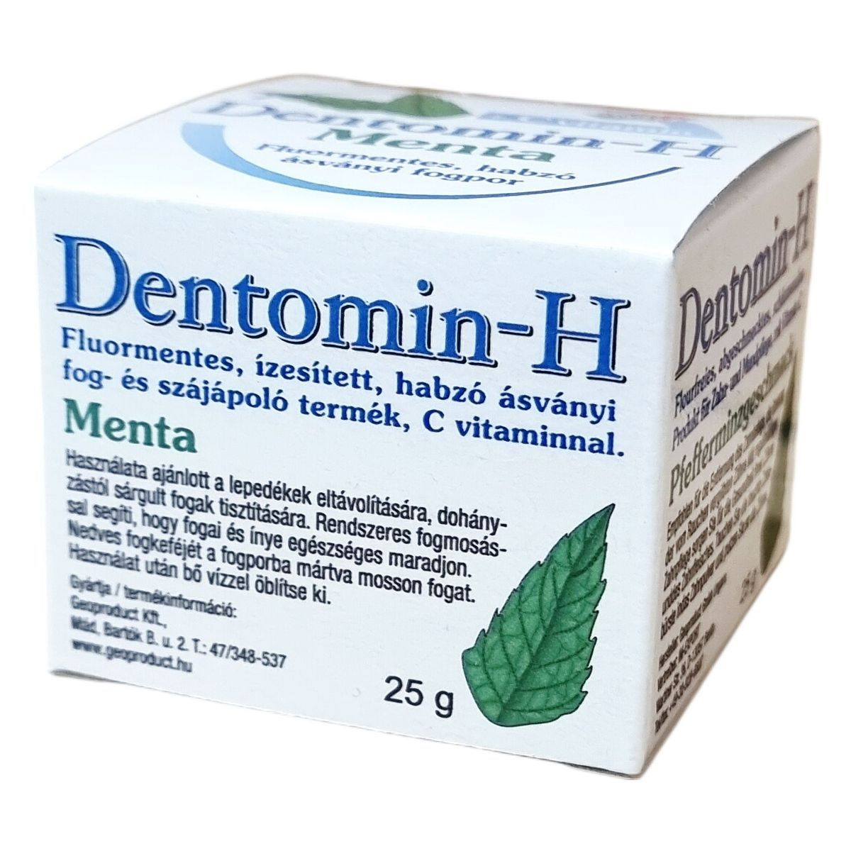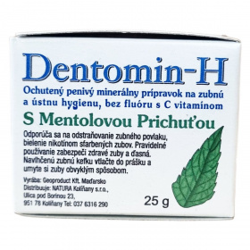 A Dentomin-H menta ízesítésű, fluort nem tartalmazó ásványi fogpor, amely rendszeres használattal támogatja a fogak és az íny egészségét. Különösen ajánlott a dohányzás miatt elszíneződött fogak tisztítására és a fogkő eltávolítására. A termék habzó, így alapos tisztítást biztosít. Tartalmaz továbbá C vitamint, amely hozzájárulhat a szájüreg egészségéhez. A fogmosás során a nedves fogkefét a porba mártva használjuk, majd a száj alapos öblítésével zárjuk a folyamatot. A csomagolás 25 gramm fogport tartalmaz.