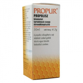 Mi a Propur csepp hatóanyaga? 50 ml készítmény tartalmaz 4.3 g propolisz kivonatot (Propolis extractum)(szárazanyagban kifejezve). Mit tartalmaz még a készítmény? Segédanyagként a készítmény tartalmaz még 85 tf%-os alkoholt, mely adagonként 0.57 g alkoholnak felel meg. Mikor ajánlott a készítmény alkalmazása? A Propur csepp alkalmazása ajánlható: általános erősítésre, étvágyjavításra, enyhe fertőzések miatti szájüregi és felső légúti megbetegedések (pl. torokgyulladás) megelőzésére illetve enyhítésére önállóan vagy a gyógyszeres terápia kiegészítéseként, gyomor-, bél- és húgyivar-rendszerben fellépő gyulladások mérséklésére.