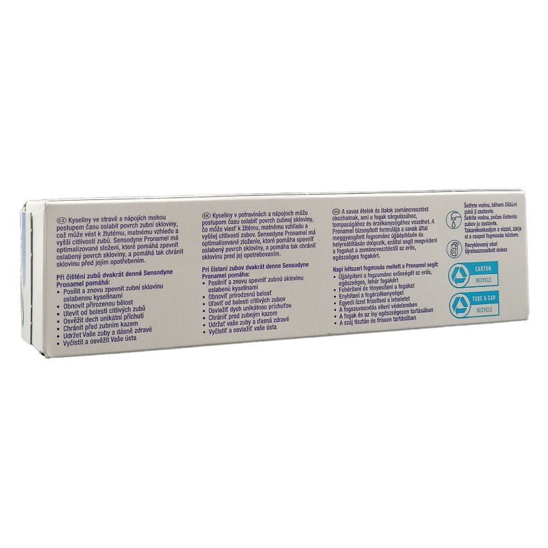 A hétköznapi ételekben pl. egyes gyümölcsökben, italokban, pl. narancslében vagy a borban lévő savak kioldhatják az ásványi anyagokat a fogakból. Ezáltal a fogzománc felpuhul, így könnyebben elkopik. A Sensodyne Pronamel fogkrém kifejezetten érzékeny fogakra lett kifejlesztve, hogy megvédje azokat a savak okozta eróziótól. Mindennapi használata segít megszilárdítani a fogzománcot. 1450 ppm nátrium-fluoridot tartalmaz.
