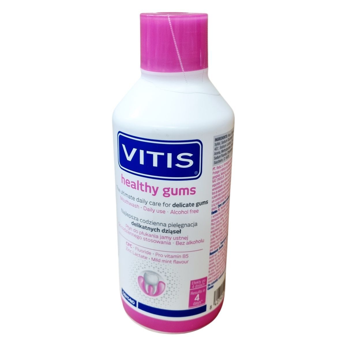 A Vitis healthy gums szájvíz mindennapos használatra készült érzékeny fogínyre. A termék csökkenti a plakk (biofilm) képződést és védi a fogínyt, összehúzó hatású, valamint erősíti a fogzománcot, ezáltal segít megelőzni a fogszuvasodást. Klinikailag igazolt, hogy már négy nap alatt csökkenti a lepedéket. Használata során 15 ml szájvizet kell 30 másodpercig öblögetni naponta legalább kétszer. Nem ajánlott érzékenység vagy nyelési nehézség esetén. A termék a Dentaid Kutatóközpont tudományos támogatásával készült, alkoholmentes és enyhe mentol ízzel rendelkezik. Kiszerelése 500 ml, gluténmentes, fluort tartalmaz. A termék gyártója a DENTAID SL, Spanyolországban, az EU-ban forgalmazza a Dent-O-Care Ltd.