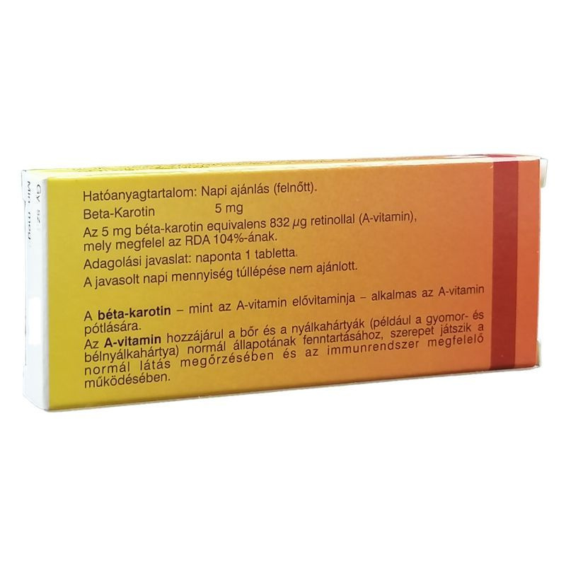 Mi a Béta-Karotin tabletta hatóanyaga? Hatóanyag 10mg Betacarotenum (Bétakarotin)/tabletta. Mit tartalmaz még a készítmény? A készítmény a következő segédanyagokat tartalmazza szacharóz, zselatin, kukoricakeményítő, mannit, makrogol 4000, povidon, nátrium-aszkorbát, tokoferol-koncentratum, aszkorbil-palmitát, magnézium-sztearát, trikalcium-foszfát, víz. A várandósság és szoptatás ideje alatt megnő a szervezet A-vitamin iránti igénye, ezért ezen élethelyzetekben alkalmazható a készítmény. Várandósság alatt 30 mg-ot meghaladó mennyiség szedése nem ajánlott. Adagolási javaslat: naponta 1 tabletta.