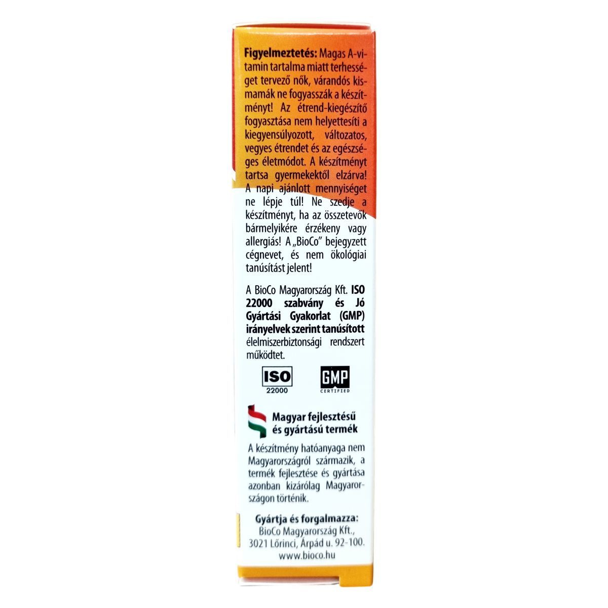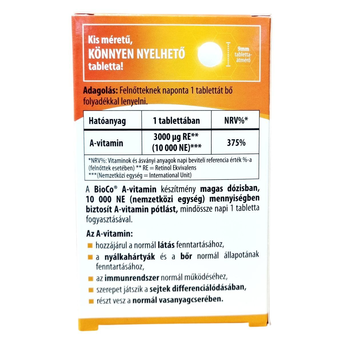A BioCo Magyarország Kft. kizárólag Magyarországon fejleszti és gyártja a készítményt, amelynek hatóanyaga nem Magyarországról származik. A tabletta kis méretű, könnyen lenyelhető. A termék a "BioCo" bejegyzett cégnevet viseli, amely nem utal ökológiai tanúsításra. Az A-vitamin hozzájárulhat a normál vasanyagcseréhez és szerepet játszhat a sejtek differenciálódásában. A készítmény használatával napi 10 000 NE (nemzetközi egység) A-vitamin bevitel valósítható meg, ami a felnőttek számára ajánlott referencia bevitel 375%-a lehet.