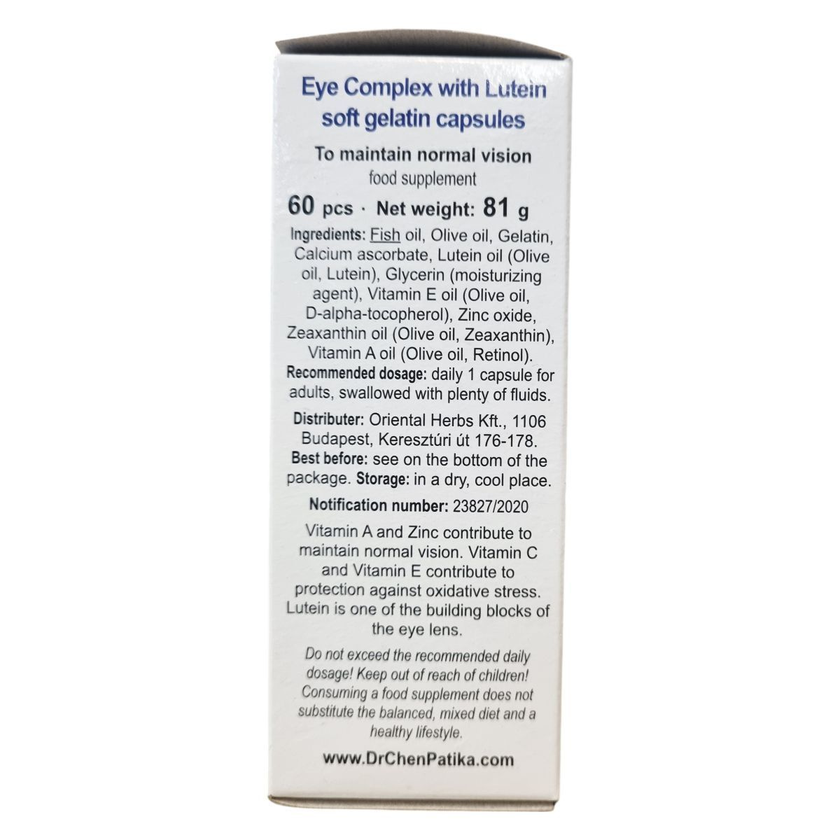 A-vitamin és a cink hozzájárulnak a normál látás fenntartásához. A C-vitamin és az E-vitamin hozzájárulnak az oxidatív stresszel szembeni védelemhez. A lutein a szemlencse egyik felépítő anyaga.