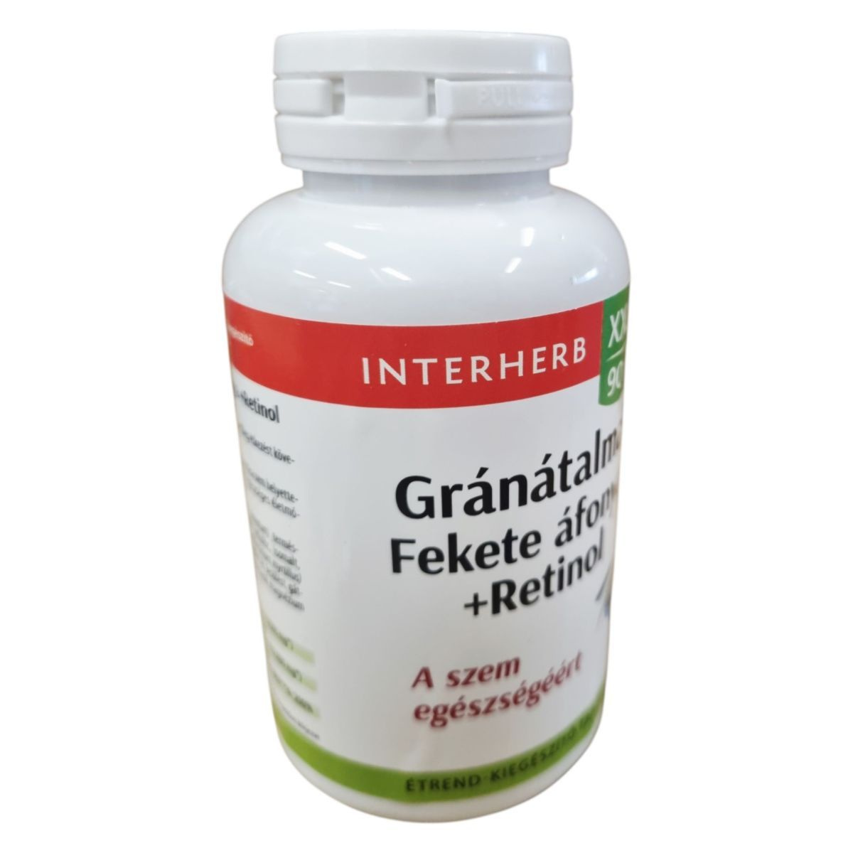 Az INTERHERB Gránátalma Fekete áfonya +Retinol étrend-kiegészítő tabletta a szem egészségének támogatására készült. A gránátalma ellagsavban gazdag, míg a fekete áfonya segítheti a szem vérkeringésének fenntartását és a retina működését. Az A-vitamin hozzájárulhat a normál látás fenntartásához és az immunrendszer normál működéséhez. A termék minőségét a csomagoláson jelzett ideig őrzi meg, és szobahőmérsékleten tárolandó. A termék forgalmazója az Interherb Kft., amelynek székhelye Budapest, Tátra u. 25.