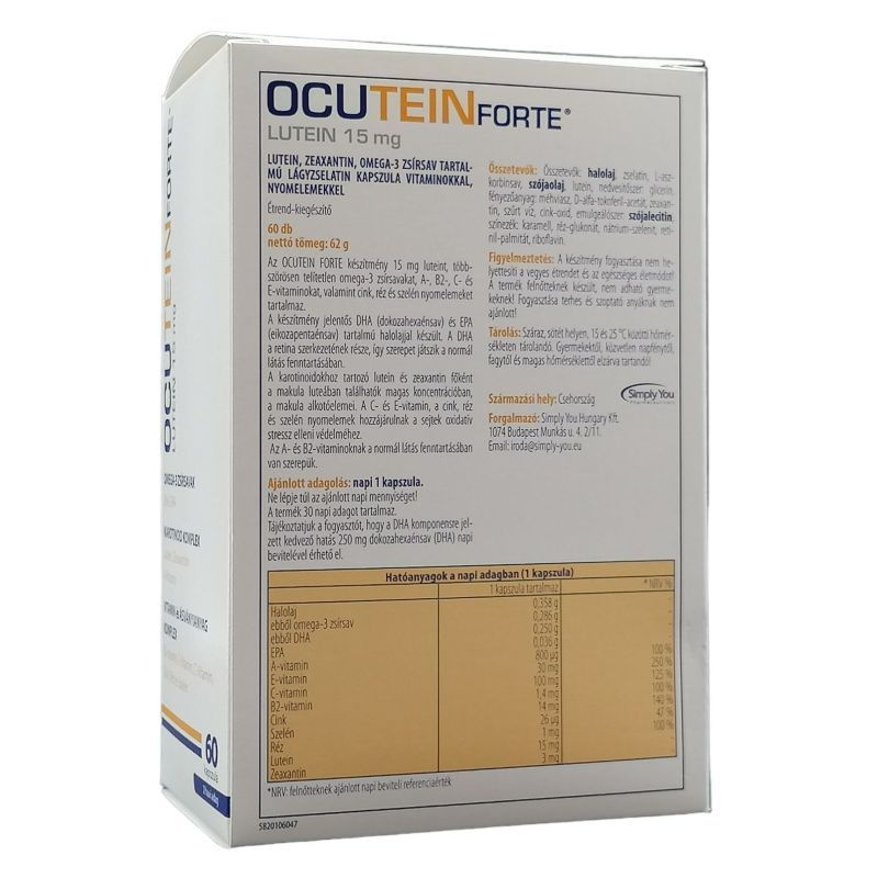 A készítmény 15 mg luteint, többszörösen telítetlen Omega-3 zsírsavakat, A- és B2-vitamint, valamint olyan vitaminokat és nyomelemeket (C- és E-vitamin, a cink, réz és szelén) tartalmaz, melyek hozzájárulnak a sejtek oxidatív stressz elleni védeleméhez.