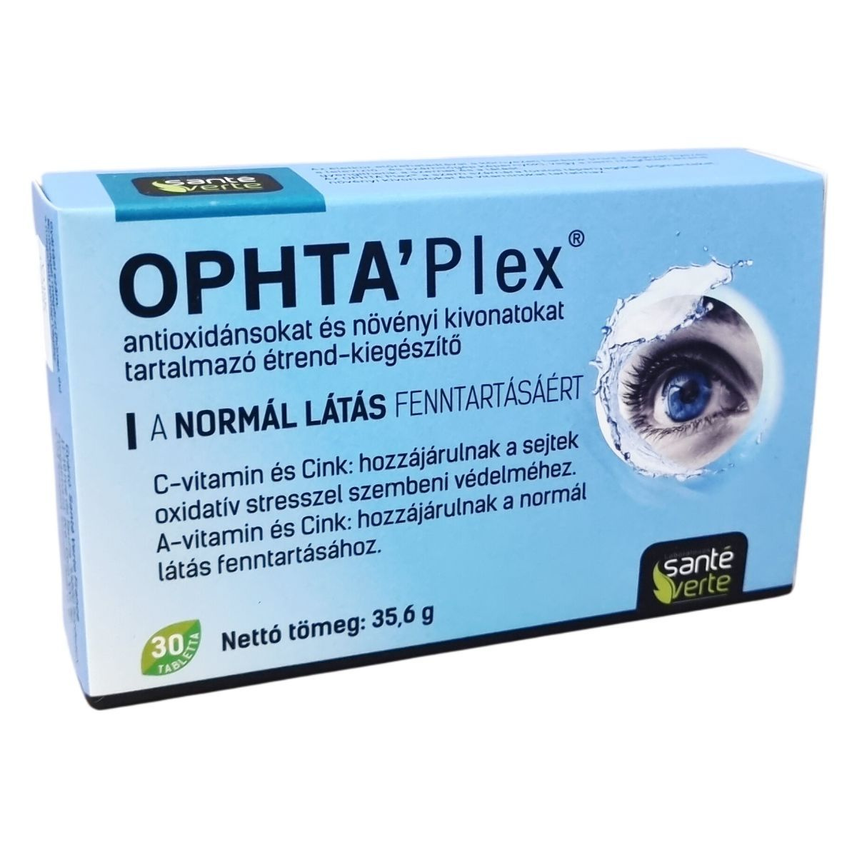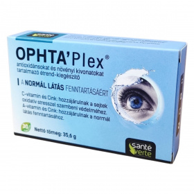 Az OPHTA'Plex® egy antioxidánsokat és növényi kivonatokat tartalmazó étrend-kiegészítő, amely C-vitamint, Cinket, A-vitamint és további hatóanyagokat egyesít az optimális szemegészség támogatására. A benne található összetevők, mint például a taurine, kvercetin, hidrolizált tengeri kollagén, valamint száraz kivonatok a szemvidítófűből és fekete áfonyából hozzájárulhatnak a szem normál működéséhez. A termék emellett antioxidáns összetevőket tartalmaz, amelyek segíthetik a sejtek oxidatív stresszel szembeni védelmét. A készítmény aktív komponenseit napi egy tabletta formájában, étkezés közben javasolt bevenni, nagy pohár vízzel. Nem ajánlott halallergiásoknak vagy dohányzóknak, továbbá terhes vagy szoptató nők esetén orvosi konzultáció szükséges. A terméket csak felnőttek használhatják, és nem helyettesíti a kiegyensúlyozott étrendet vagy az egészséges életmódot.