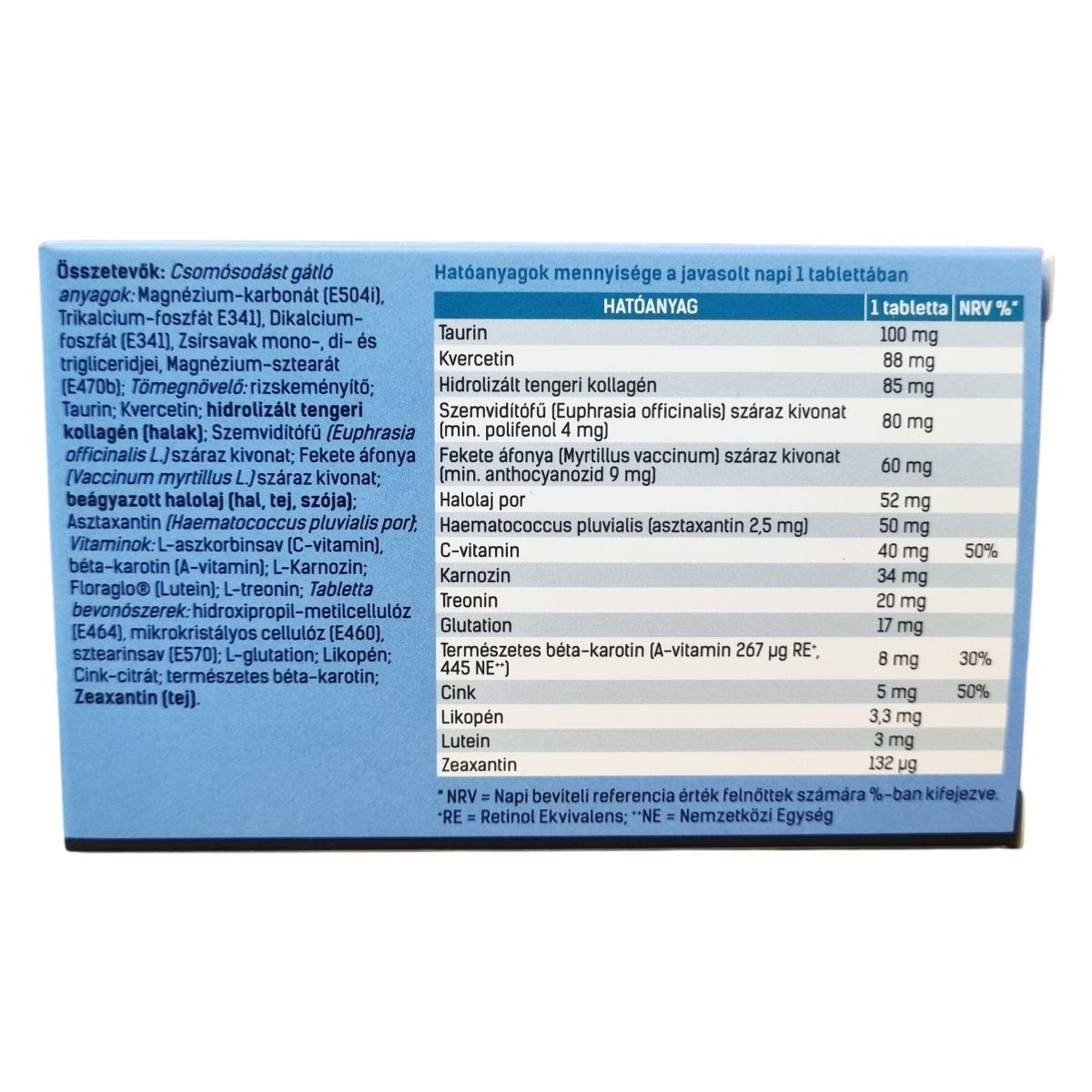 Magnézium-karbonát (E504i), Trikalcíum-foszfát (E341), Dikalcium-foszfát (E341), Zsírsavak mono-, di- és trigliceridjei, Magnézium-sztearát (E470b), Rizskeményítő, Taurin, Kvercetin, Hidrolizált tengeri kollagén (halak), Szemvidítófű (Euphrasia officinalis L.) száraz kivonat, Fekete áfonya (Vaccinum myrtillus L.) száraz kivonat, Beágyazott halolaj (hal, tej, szója), Asztaxantin (Haematococcus pluvialis por), L-aszkorbinsav (C-vitamin), Béta-karotin (A-vitamin), L-Karnozin, Floraglo® (Lutein), L-treonin, Hidroxipropil-metilcellulóz (E464), Mikrokristályos cellulóz (E460), Sztearinsav (E570), L-glutation, Likopén, Cink-citrát, Természetes béta-karotin, Zeaxantin (tej)
