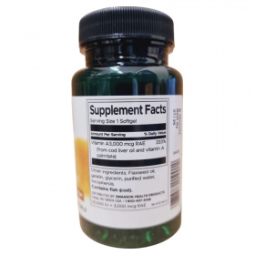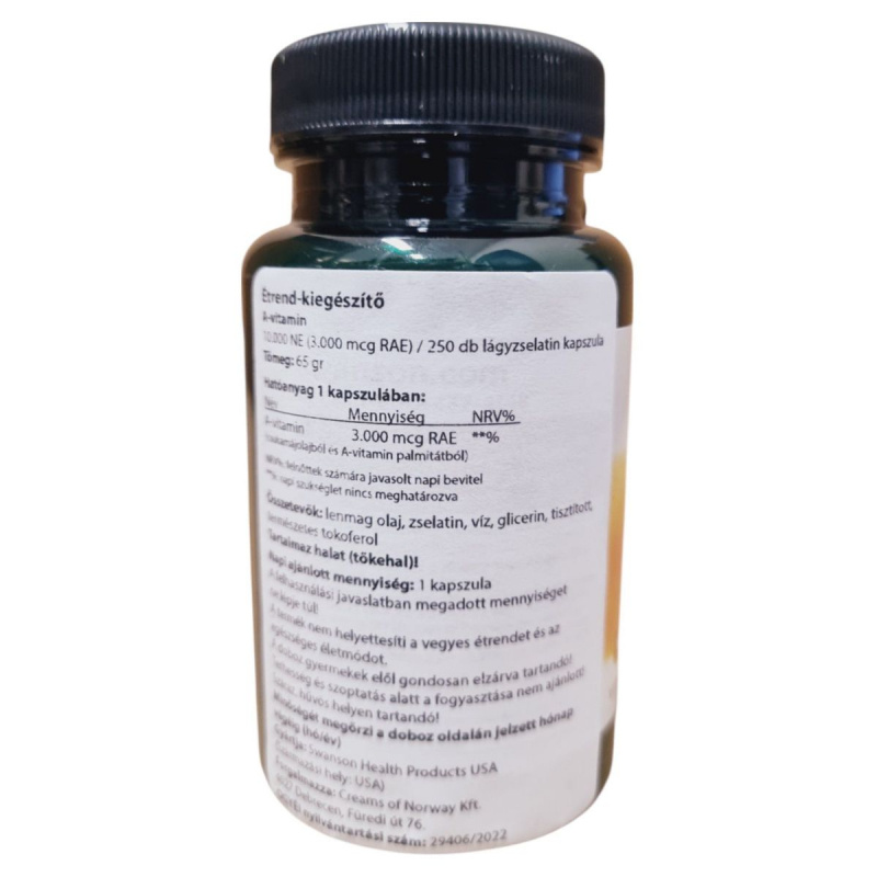A Swanson Health Products A-vitamin étrend-kiegészítője 250 db lágyzselatin kapszulát tartalmaz, melyek mindegyike 3.000 mcg RAE A-vitamint biztosít. Az A-vitamin csukamájolajból és A-vitamin palmitátból származik, és hozzájárulhat a normál látás fenntartásához, valamint támogathatja az immunrendszer egészséges működését. A termék lenmag olajat, zselatint, vizet, glicerint és természetes tokoferolt tartalmaz. Fontos megjegyezni, hogy a termék halat (tőkehal) tartalmaz, ezért halallergiások számára nem ajánlott. A kapszulák tárolása száraz, hűvös helyen javasolt, és a termék fogyasztása terhesség és szoptatás alatt nem ajánlott. A termék forgalmazója a Creams of Norway Kft., Debrecen.