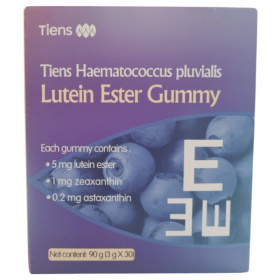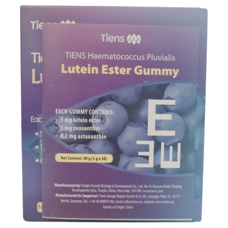 A Tiens Lutein Ester Gummy egy növényi alapú gumicukor, mely lutein-észtert, zeaxanthint és haematococcus pluvialis kivonatból származó asztaxantint tartalmaz. A készítmény célja a szem védelme és az oxidatív stressz csökkentése, miközben finom és praktikus formában biztosítja a hatóanyagokat. Az áfonya koncentrátum és természetes aromák tovább fokozzák a termék vonzerejét.