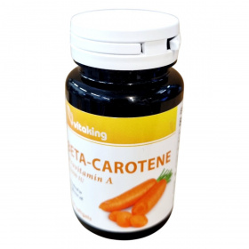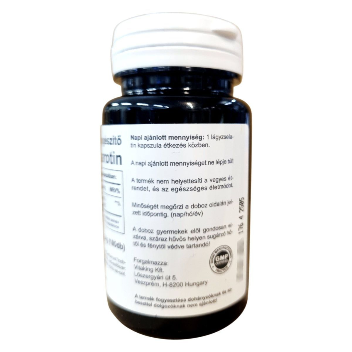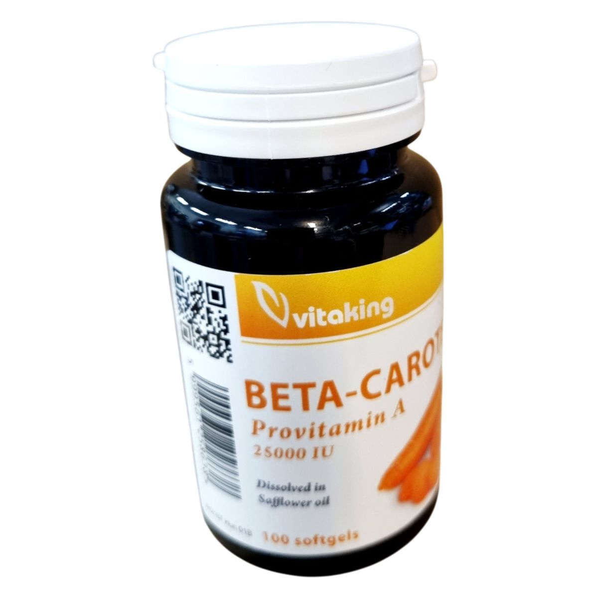 A Vitaking BETA-CAROTENE egy béta-karotin tartalmú étrend-kiegészítő, amely provitamin A-t tartalmazhat, és 25000 NE béta-karotint biztosíthat. A termék sáfrány olajban van feloldva, és 100 lágyzselatin kapszulát tartalmaz. A béta-karotin hozzájárulhat a normál látás fenntartásához és az immunrendszer támogatásához. A termék fogyasztása dohányzóknak és azbeszttel dolgozóknak nem ajánlott. Tárolása száraz, hűvös helyen, sugárzó hőtől és fénytől védve ajánlott. A termék nem helyettesíti a vegyes étrendet és az egészséges életmódot.