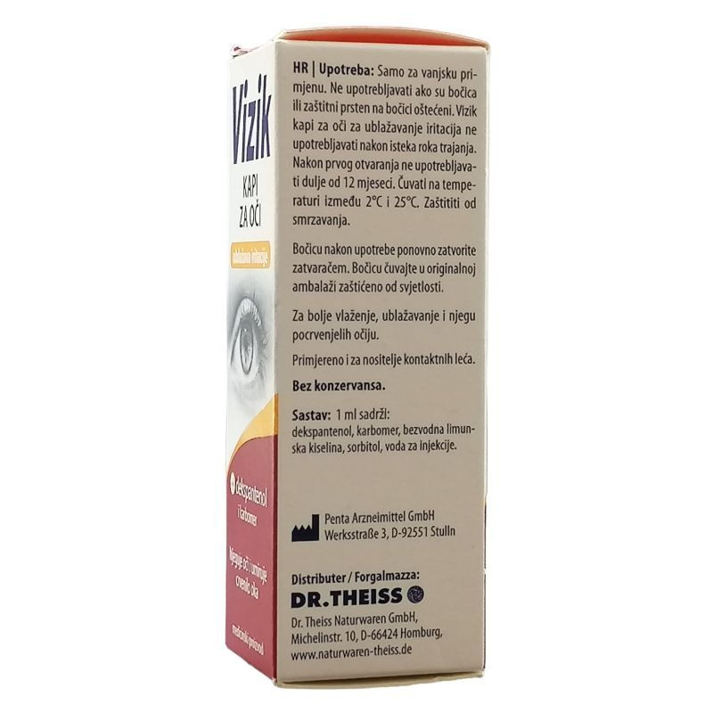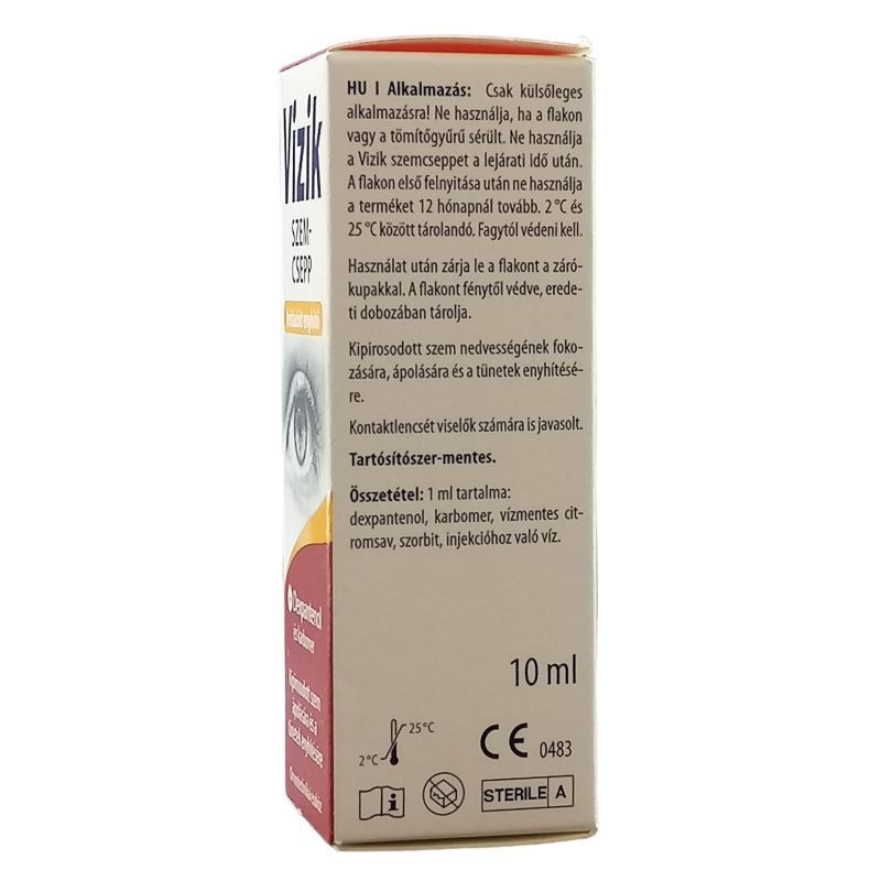 Ezt főleg a B5-provitamin (dexpantenol) biztosítja, mely a magas vízmegkötő képessége miatt olyan tulajdonsággal rendelkezik, mely nedvesíti és ezenkívül ápolja a szemet. A dexpantenol nedvesítő tulajdonságát a karbomer összetevő támogatja. Ez egy sikosító- és védőfilmet képez a szaru- és kötőhártyán, és ezáltal kompenzálja a hiányzó könnyfolyadékot. A Vizik Irritációt enyhítő szemcsepp védi és nedvesíti a szem felületét és síkossá teszi azt. Ezáltal hosszantartó enyhülést eredményez olyan panaszok esetén, mint