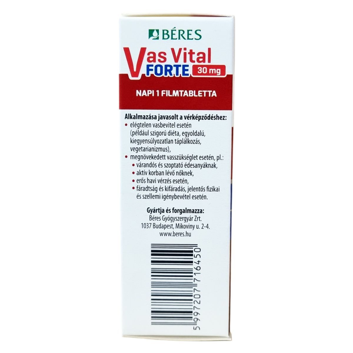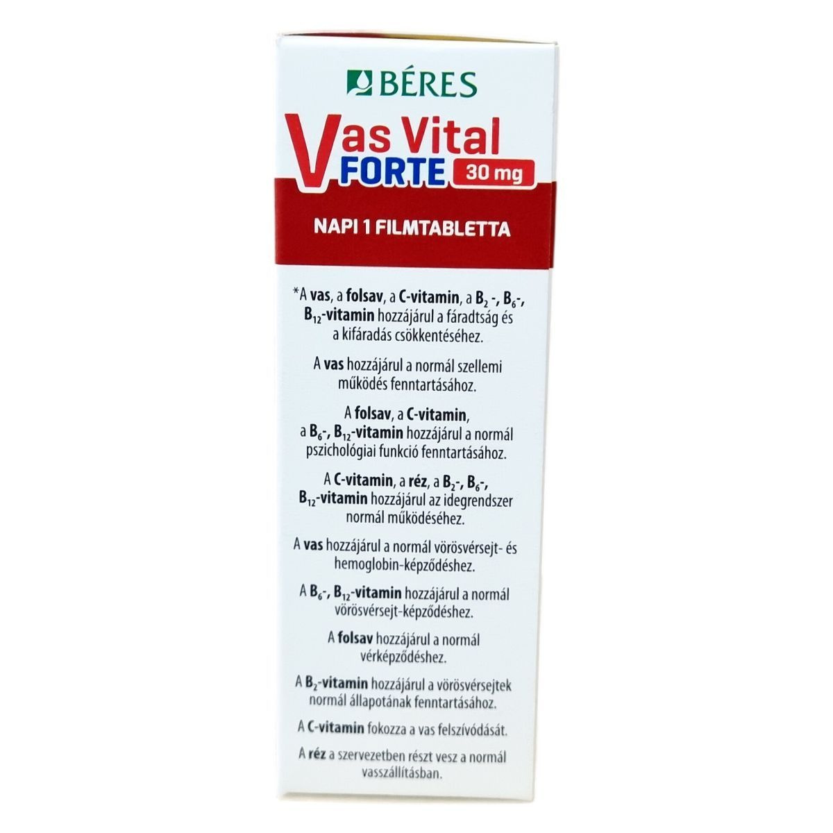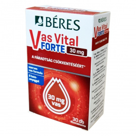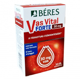A Béres Vas Vital Forte 30 mg filmtabletta komplex étrend-kiegészítő készítmény, amely szerves kötésű vassal (vas-fumaráttal), vitaminokkal és nyomelemekkel készül. A benne lévő vas, folsav, C-vitamin, B2-, B6- és B12-vitamin hozzájárulhat a fáradtság és kifáradás csökkentéséhez, a normál szellemi működés fenntartásához, valamint a normál pszichológiai funkciók és az idegrendszer működéséhez. A vas részt vesz a normál vörösvérsejt- és hemoglobin-képződésben, míg a folsav és a B-vitaminok a vérképződés fenntartásához járulhatnak hozzá. A C-vitamin fokozhatja a vas felszívódását, a réz pedig részt vesz a normál vasszállításban. Az alkalmazása javasolt elégtelen vasbevitel esetén, például szigorú diéta vagy kiegyensúlyozatlan táplálkozás esetén, valamint megnövekedett vasszükséglet esetén, mint várandósság, szoptatás, aktívkorú nők, erős menstruáció vagy fokozott fizikai és szellemi terhelés esetén.