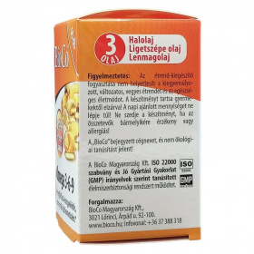 Rendszeres - legalább heti kétszeri - tengeri hal fogyasztással elősegíthetjük a szervezet számára értékes Omega 3 zsírsavak bevitelét. A tengeri halakban található két Omega 3 zsírsav, az EPA és a DHA hozzájárul a vér normál triglicerid szintjének megtartásához, az egészséges szívműködéshez és a normális véralvadás fenntartásához. Az Omega 3 zsírsavak elősegítik a normális vérnyomás megőrzését. Az alfa-linolénsav (ALA) szintén többszörösen telítetlen Omega 3 zsírsav, melynek megfelelő fogyasztása hozzájárul a vér összes és LDL koleszterin szintjének normál értéken tartásához. Összetevők: halolaj; lenmagolaj; zselatin kapszulahéj; ligetszépe olaj; nedvesítőszer (glicerin), antioxidáns (D-alfa-tokoferol) Tápanyagösszetétel kapszulánként Energiatartalom: 42,2 kJ (10 kcal); Fehérje: 0,21 g; Szénhidrát: 0 g; Zsír: 1 g Zsírsav összetétel kapszulánként Telített zsírsavak: 200 mg Telítetlen zsírsavak: 800 mg - ebből egyszeresen telítetlen zsírsavak: 213 mg - ebből többszörösen telítetlen zsírsavak: 587 mg Omega-zsírsavak 1 kapszulában EPA (Omega-3) 85 mg DHA (Omega-3) 55 mg ALA (alfa-linolénsav, Omega-3) 150 mg GLA (gamma-linolénsav, Omega-6) 20 mg LA (linolsav, Omega-6) 170 mg Olajsav (Omega-9) 90 mg Nettó tömeg: 81 g / 60 db kapszula Alkalmazási javaslat: Felnőttek számára napi 1 kapszula szedését javasoljuk. A kapszulát bő vízzel kell lenyelni. Minőségét megőrzi: lásd a flakon alján, a jelzett hónap végéig Tárolás: A készítményt tartsa gyermekektől elzárva, száraz, hűvös, sötét helyen! A termék kupakját mindig gondosan zárja vissza! Figyelmeztetés: Az étrend-kiegészítő fogyasztása nem helyettesíti a kiegyensúlyozott, változatos, vegyes étrendet és az egészséges életmódot! A napi ajánlott mennyiséget ne lépje túl!
