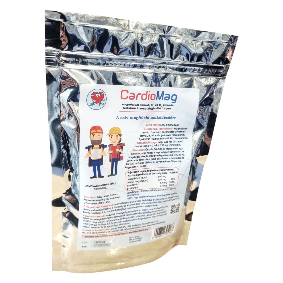 A CardioMag étrend-kiegészítő italpor magnézium-taurátot, továbbá B1- és B6-vitaminokat tartalmaz, melyek együttesen hozzájárulhatnak a szív megfelelő működéséhez. A magnézium szerepet játszhat az izomműködésben, ide értve a szívizmot, az idegrendszer megfelelő működésében, a fáradtság és kimerültség csökkentésében, valamint az elektrolit egyensúly fenntartásában. A készítmény segédanyagai közé tartozik a citromsav, természetes alapú édesítőszer (eritritol és stevia) és citromaroma, amelyek kellemes ízt biztosítanak az italpornak. Az adagolás során a napi adagot meleg vagy hideg vízhez kell keverni, majd azonnal fogyasztani. Az OGYÉI által nyilvántartott formula körültekintő tárolást igényel, és különösen ajánlott, hogy veseelégtelenségben szenvedők, illetve idősebb személyek orvosi tanácsot kérjenek a fogyasztás megkezdése előtt. A javasolt napi bevitelt nem szabad túllépni, és ez az étrend-kiegészítő nem helyettesíti a változatos, egészséges táplálkozást és életmódot.