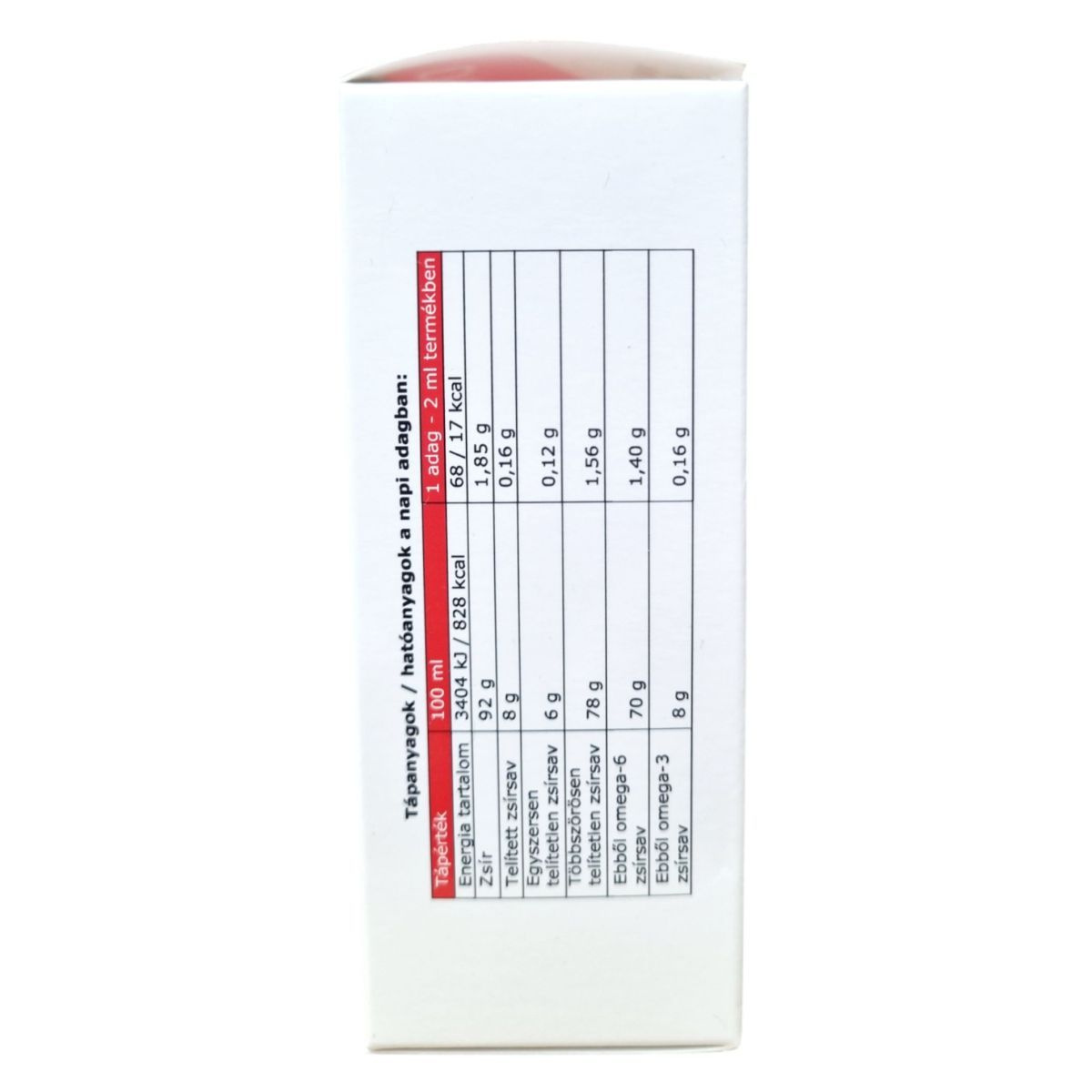 Zsír 92 g, ebből telített zsírsav 8 g, egyszeresen telítetlen zsírsav 6 g, többszörösen telítetlen zsírsav 78 g, ebből omega-6 zsírsav 70 g, omega-3 zsírsav 8 g