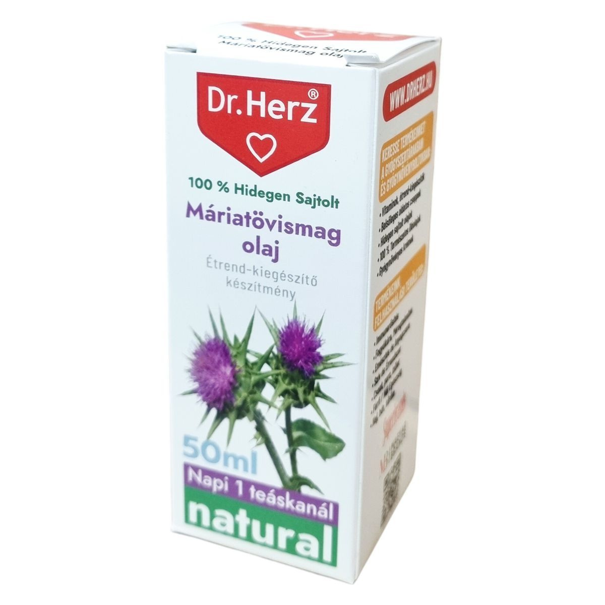 A Dr.Herz® 100 % hidegen sajtolt máriatövismag olaj természetes összetevőkből készül, és hidegen sajtolt eljárással állítják elő, hogy megőrizzék a kiváló minőségét. Termékeik között megtalálhatók vitaminok, étrend-kiegészítők, belsőleges oldatos cseppek, hidegen sajtolt olajok, 100% természetes illóolajok és gyógynövényes krémek. Különféle felhasználási területekre kínálnak megoldásokat, például immunerősítésre, fogyókúrára, méregtelenítésre, emésztés és anyagcsere támogatására, szív- és érrendszeri egészségre, csont-, porc- és ízületvédőként, valamint férfi és női egészség, illetve haj, bőr és köröm ápolására. A termék a megszokott napi étrend kiegészítésére alkalmas, és természetes összetételének köszönhetően támogatni tudja az egészséges életmódot.