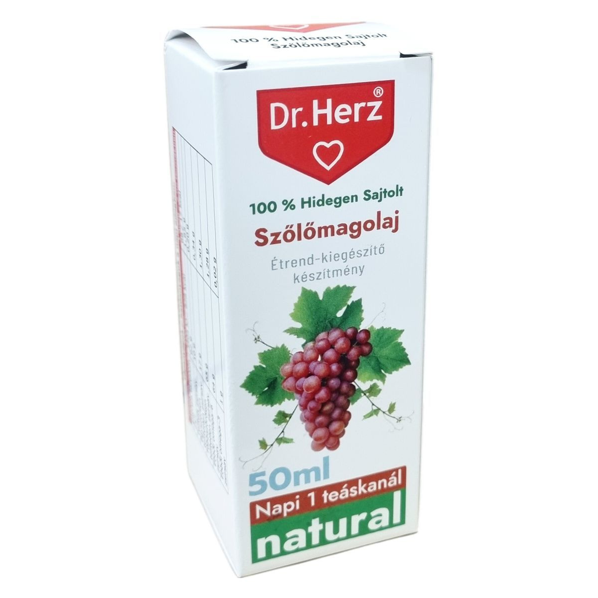 A Dr.Herz 100% hidegen sajtolt szőlőmagolaj készítmény természetes megoldásként támogatja az immunerősítést, fogyókúrát, méregtelenítést, az emésztést és anyagcserét, továbbá a szív és érrendszer, csontok, porcok, ízületek, valamint a haj, bőr és köröm egészségét. Termékeink megtalálhatók gyógyszertárakban és gyógynövényboltokban, széles választékban, többek között vitaminok, étrend-kiegészítők, belsőleges oldatos cseppek, hidegen sajtolt olajok, természetes illóolajok és gyógynövényes krémek formájában.