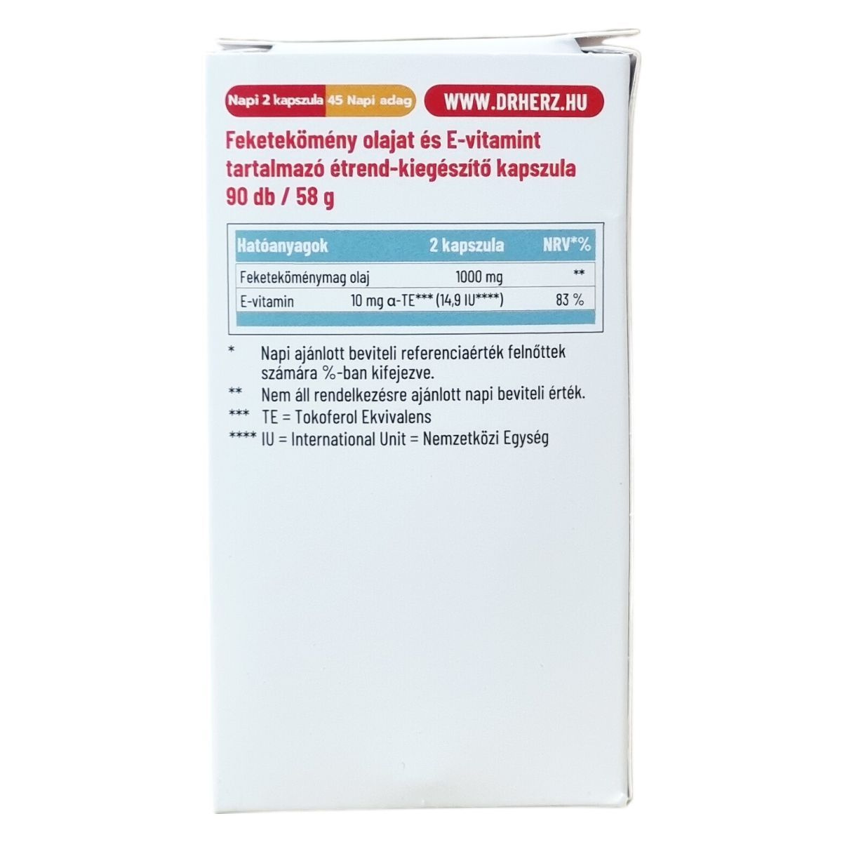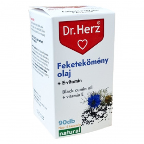 A Dr.Herz Feketekömény olaj + E-vitamin kapszula egy természetes étrend-kiegészítő, amely Egyiptomi feketeköménymag olajat (Nigella sativa) és E-vitamint tartalmaz. A terméket napi két kapszula fogyasztására javasolják főétkezések előtt, bőséges folyadékkal, szétrágás nélkül. A termék fő hatóanyagai a feketeköményolaj és az E-vitamin, amelyeket a szervezet általános támogatására használhatnak. Kizárólag természetes összetevőkből készül, és gondosan előállított kapszulában kerül forgalomba. A termék csak gyógyszertárakban és gyógynövényboltokban érhető el, ahol a Dr.Herz további vitaminokat, étrend-kiegészítőket, illóolajokat és gyógynövényes krémeket is kínál különféle egészségügyi területekre, mint az immunerősítés, anyagcsere, szív- és érrendszer, valamint haj, bőr és köröm ápolása. A termék tárolása szobahőmérsékleten, fénytől és nedvességtől védett helyen ajánlott. Az ajánlott napi adagot nem szabad túllépni, és a termék nem helyettesíti a kiegyensúlyozott étrendet és az egészséges életmódot.